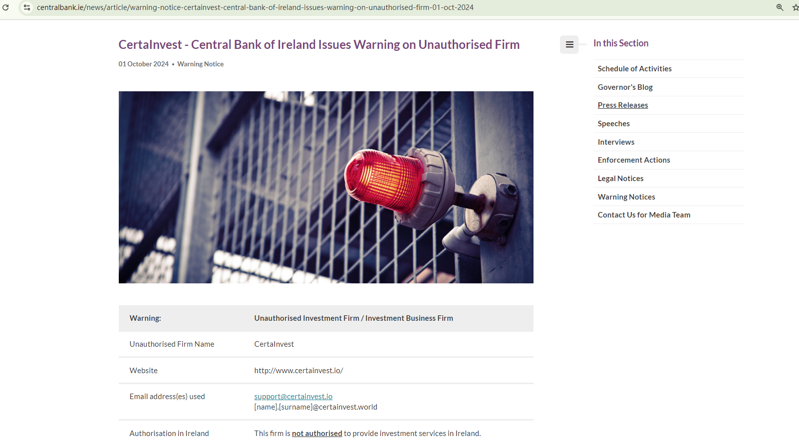 On October 1st, 2024, the Central Bank of Ireland blacklisted CertaInvest for the lack of the required authorization. https://www.centralbank.ie/news/article/warning-notice-certainvest-central-bank-of-ireland-issues-warning-on-unauthorised-firm-01-oct-2024