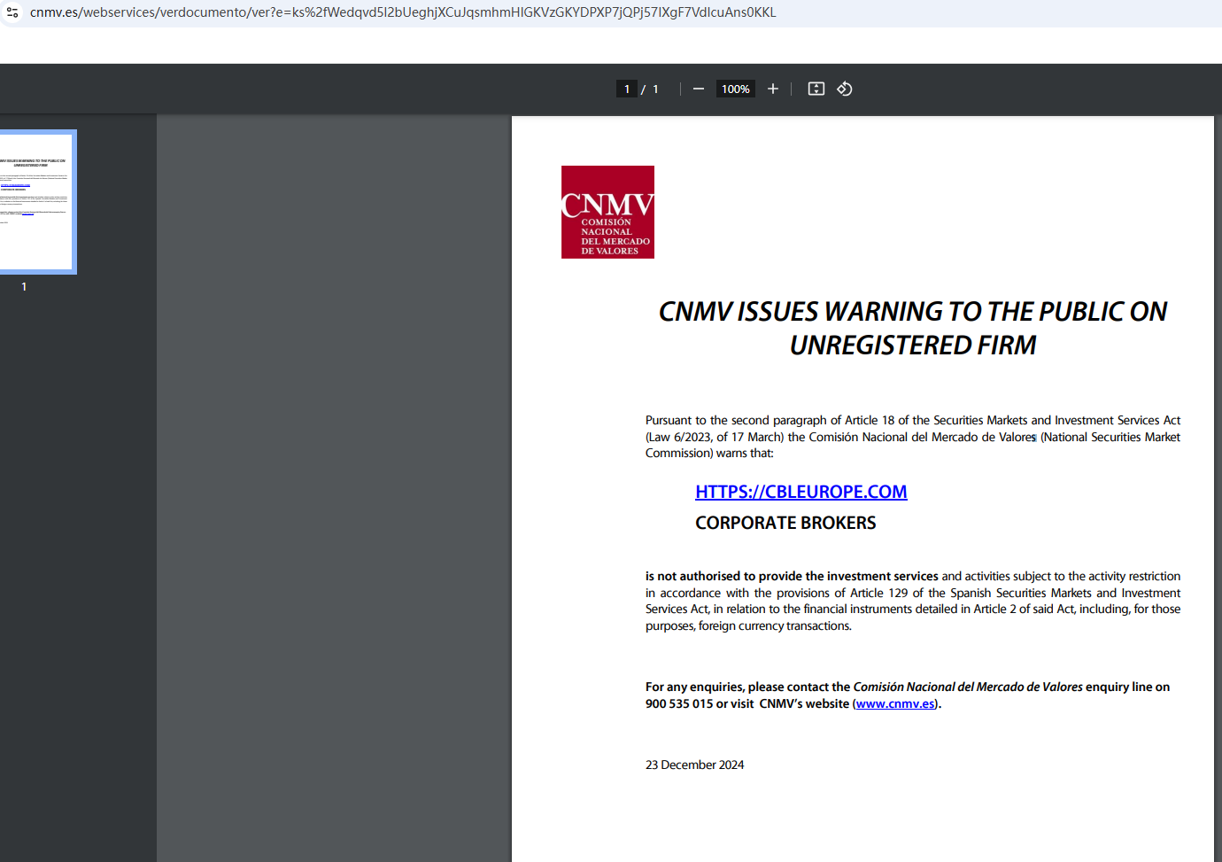 • Dec 22, 2024 The CNMV issues a warning against CORPORATE BROKERS