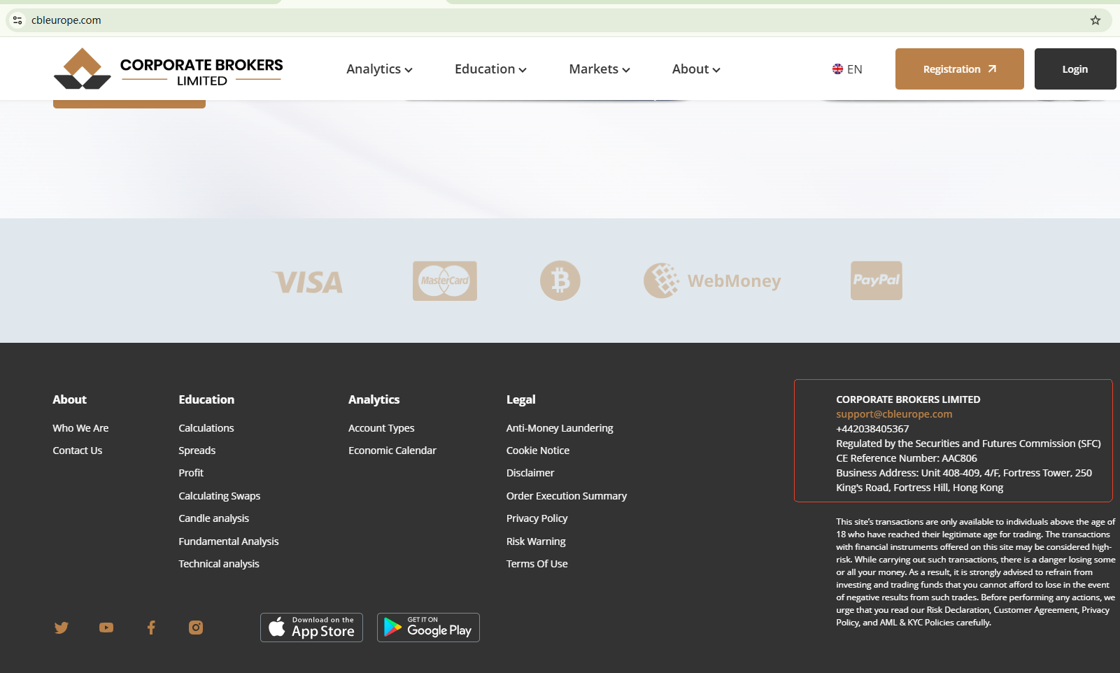 The site cbleurope.com has emerged recently, with its domain name just registered in April 2024. It copies and misuses information of a real company Corporate Brokers Limited, which is licensed by the Hong Kong Securities and Futures Commission (HK SFC), to create the false impression of being legitimate and authorized. The HK SFC has issued a warning, stating that Corporate Brokers Limited doesn't have any association with the site cbleurope.com. This is identity fraud.