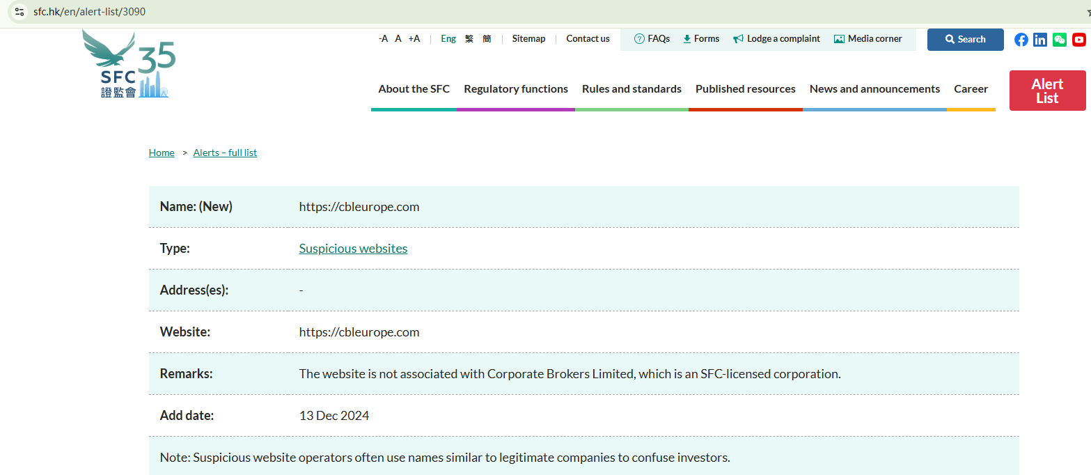 On December 13, 2024, the Hong Kong Securities and Futures Commission (HK SFC) issued a warning about cbleurope.com, identifying it as a suspicious website and clarifying that it has no affiliation with Corporate Brokers Limited. https://www.sfc.hk/en/alert-list/3090