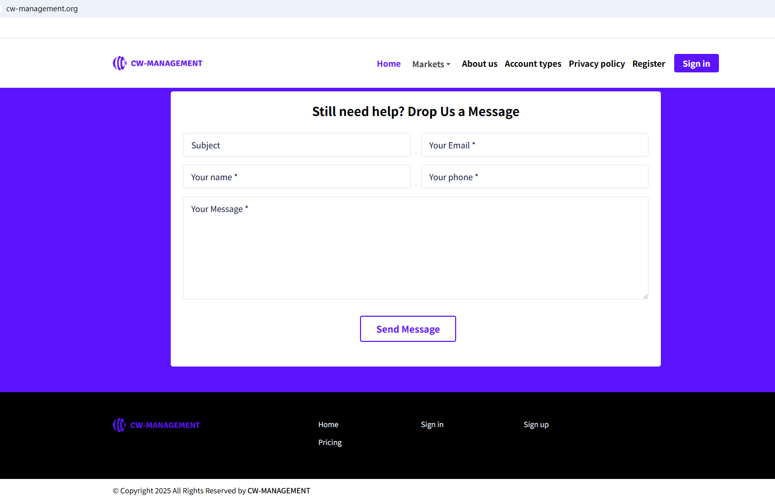 cw-management.org’s website provides no regulatory disclosures and fails to list basic corporate information, such as its legal entity name, registered address, jurisdiction of incorporation, or contact details. This lack of transparency makes it impossible to verify whether the platform holds any valid license or operates under legitimate oversight. In addition, the Financial Conduct Authority (FCA) flagged cw-management.org, identifying it as a clone firm.