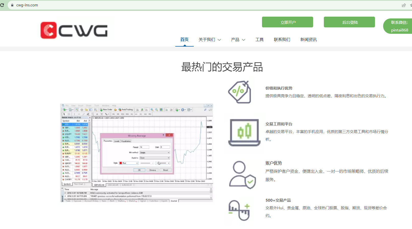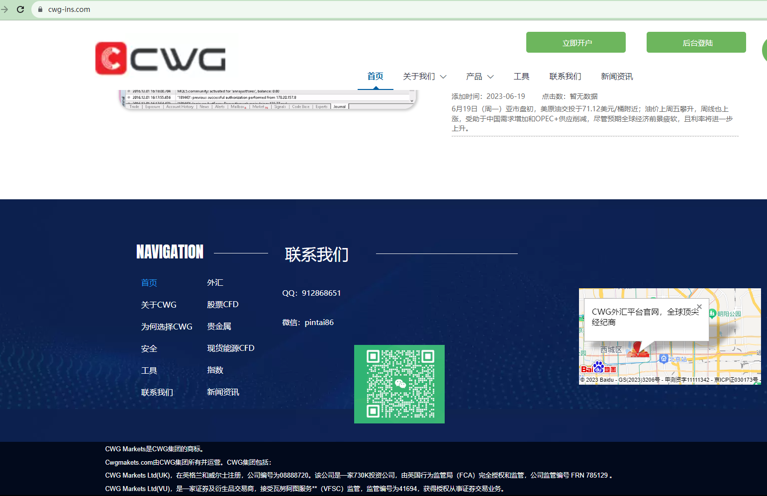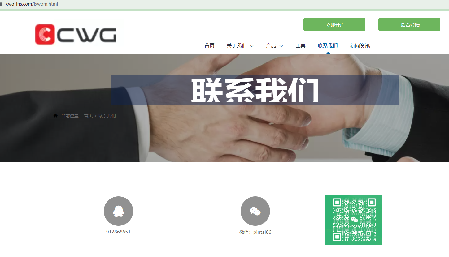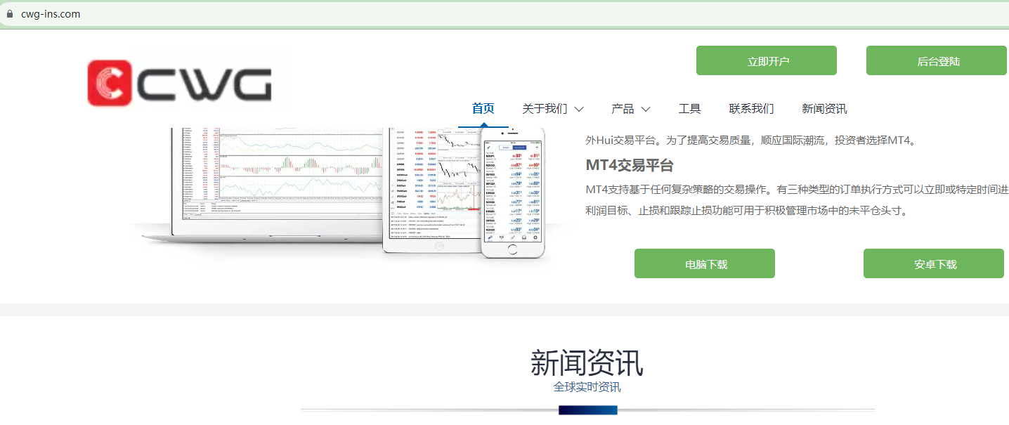 The website https://www.cwg-ins.com/ is a counterfeit of the legitimate forex broker, CWG Markets. Upon visiting this site, you'll notice the unauthorized use of the CWG Markets' logo. Furthermore, the site's content is entirely in Chinese, which is noteworthy, considering China does not issue licenses to forex brokers.