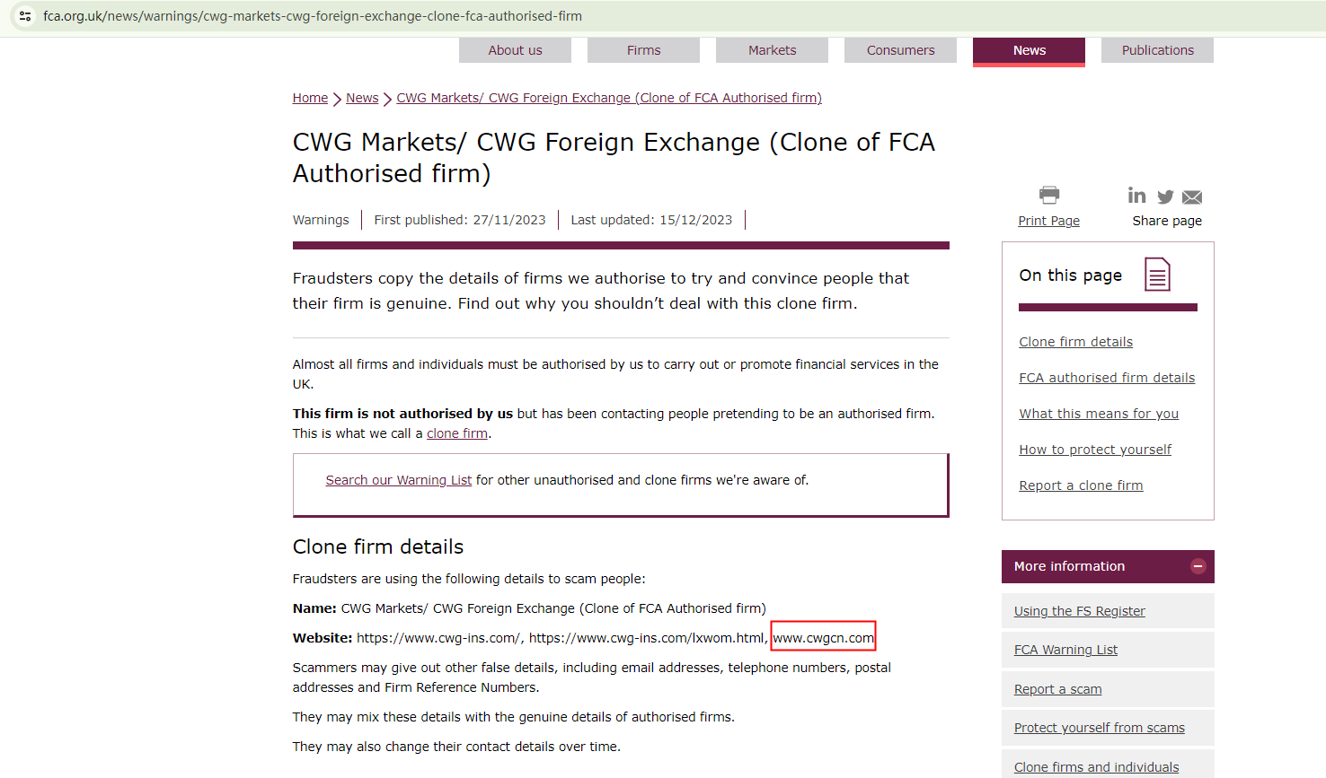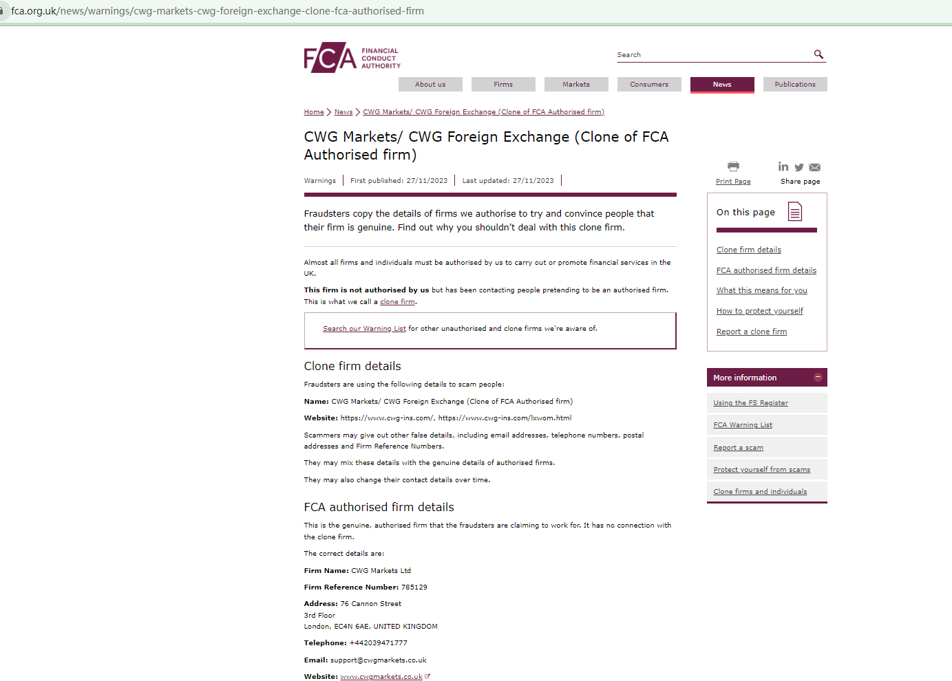 The website https://www.cwg-ins.com/ is a counterfeit of the legitimate forex broker, CWG Markets. Upon visiting this site, you'll notice the unauthorized use of the CWG Markets' logo. Furthermore, the site's content is entirely in Chinese, which is noteworthy, considering China does not issue licenses to forex brokers.This fraudulent version of CWG Markets goes as far as copying the licensing data from the legitimate site (as seen in the first screenshot from the counterfeit site and the second from the real CWG Markets).The Financial Conduct Authority (FCA) has investigated this clone firm and issued a warning against it.Investors trading with this counterfeit CWG Markets risk falling victim to fraud and identity theft. Therefore, we strongly advise traders to avoid this platform to protect their interests and ensure their safety.