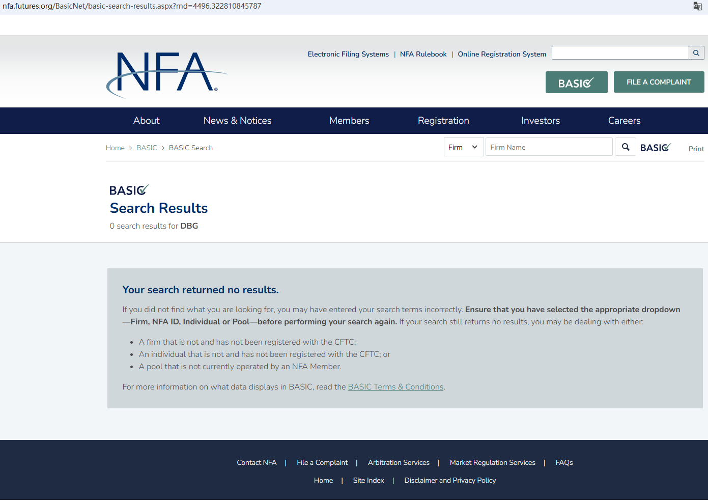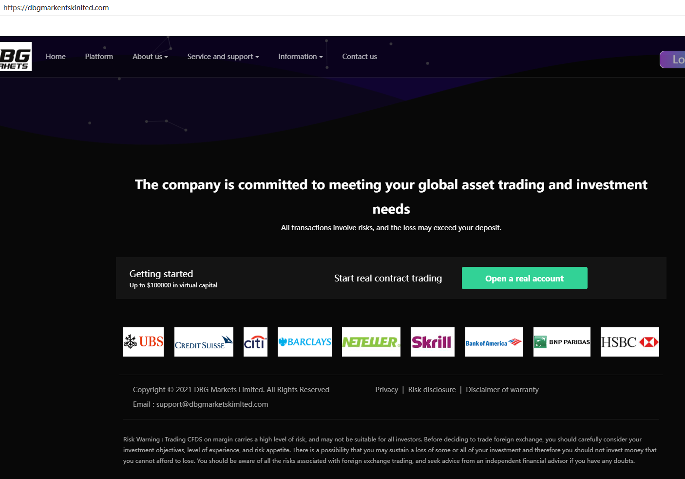 The website dbgmarkentskinlted.com is involved in identity theft. First, it misuses the logo of the real broker DBG Markets to make it look real. Second, it claims to be regulated by the National Futures Association (NFA) and Money Services Business (US MSB). The funny thing is that MSB does not have the authority to regulate forex and we did not find any matching information on the NFA. In fact, DBG Markes is not responsible for tmgmltd.com. The New Zealand Financial Markets Authority (NZ FMA) has blacklisted the website dbgmarkentskinlted.com due to fraudulent activities on the website. Therefore, dbgmarkentskinlted.com is a scam.