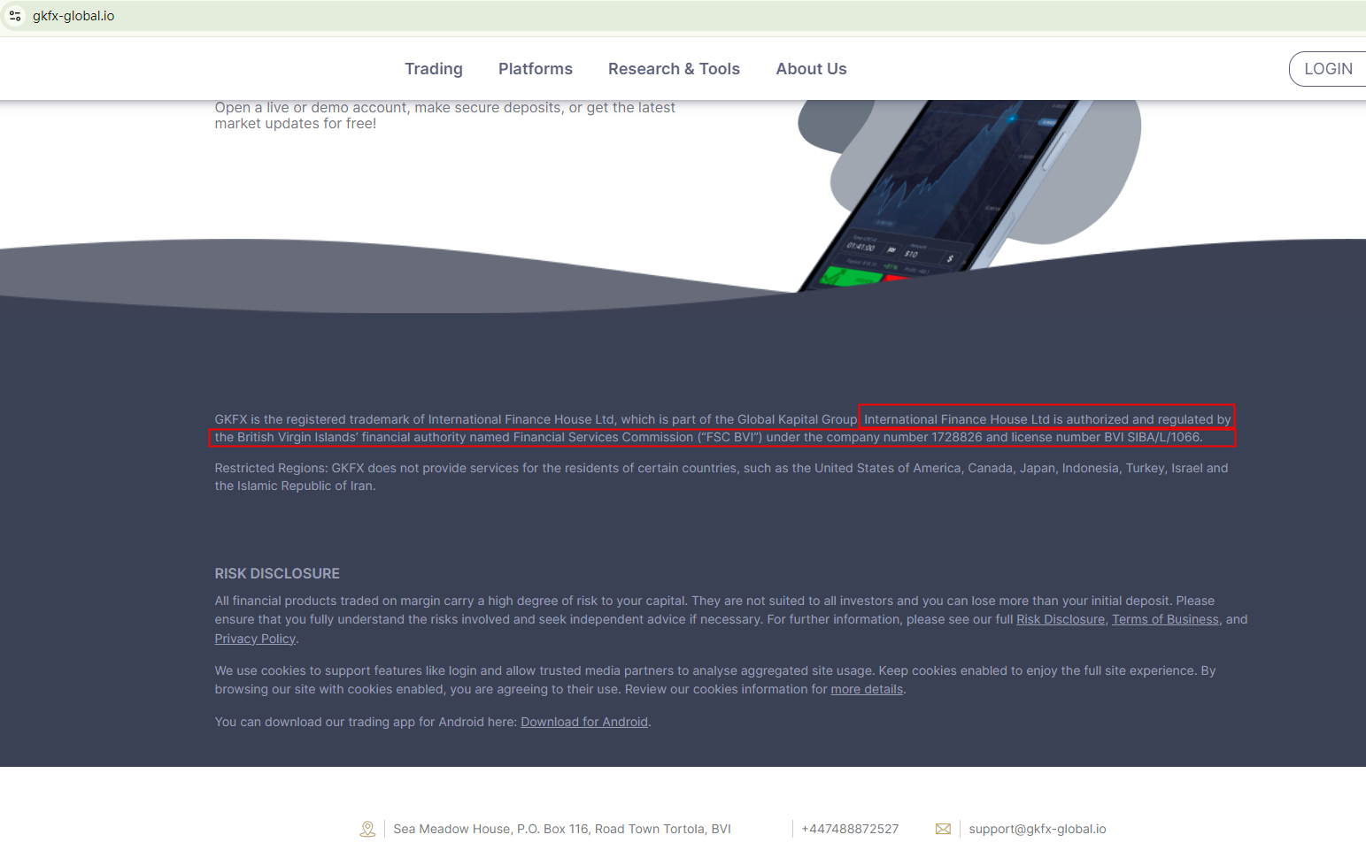 The domain name gkfx-global.io was recently registered in April 2024. The operator of the website refers to itself as "GKFX" and claims that the company behind it is International Finance House Ltd, supposedly licensed by the British Virgin Islands Financial Services Commission (BVI FSC), under number BVI SIBA/L/1066. However, International Finance House Ltd is not on the register of the BVI FSC, and the said license number is linked to Trive International Ltd., who has acquired real GKFX. The "GKFX" that offers financial services or products at gkfx-global.io is suspected fake and a case of identity theft.
