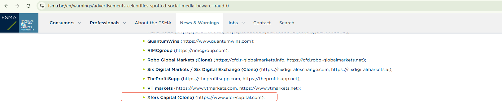 On March 19, 2025, the Belgian Financial Services and Markets Authority (FSMA) added xfer-capital.com to its warning list as a fraudulent trading platform operating in the Belgian market and advised investors to stay away from it. https://www.fsma.be/en/warnings/advertisements-celebrities-spotted-social-media-beware-fraud-0