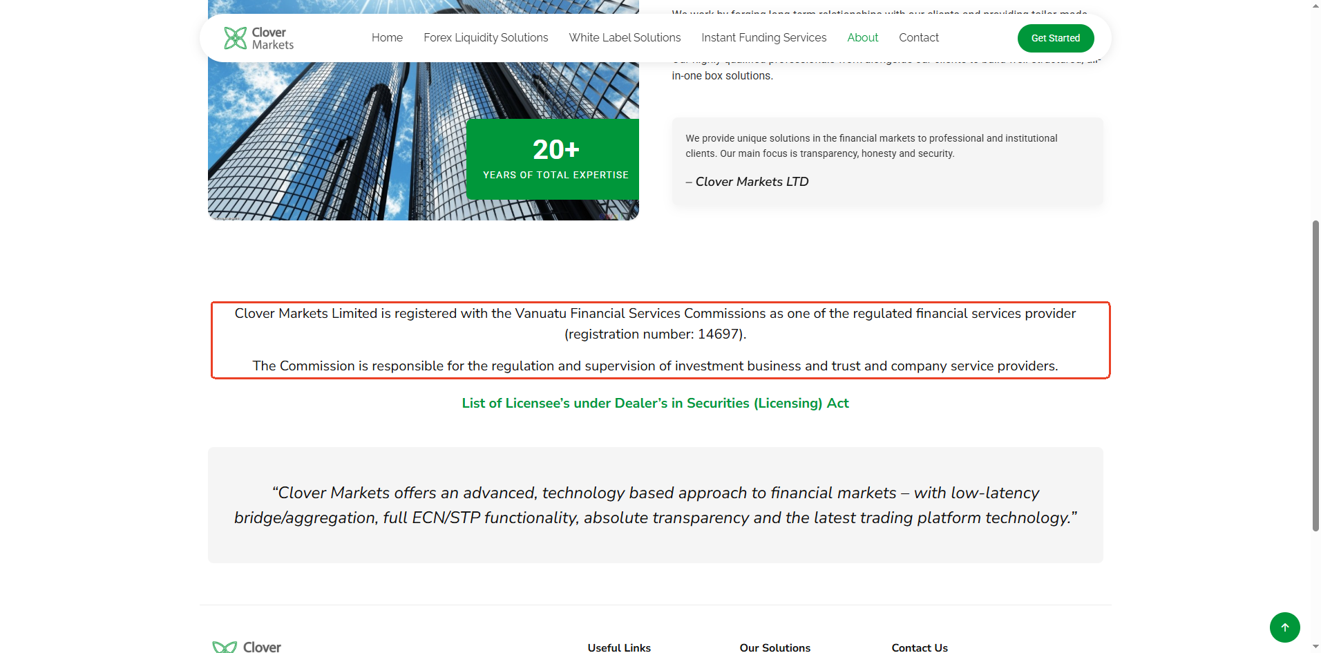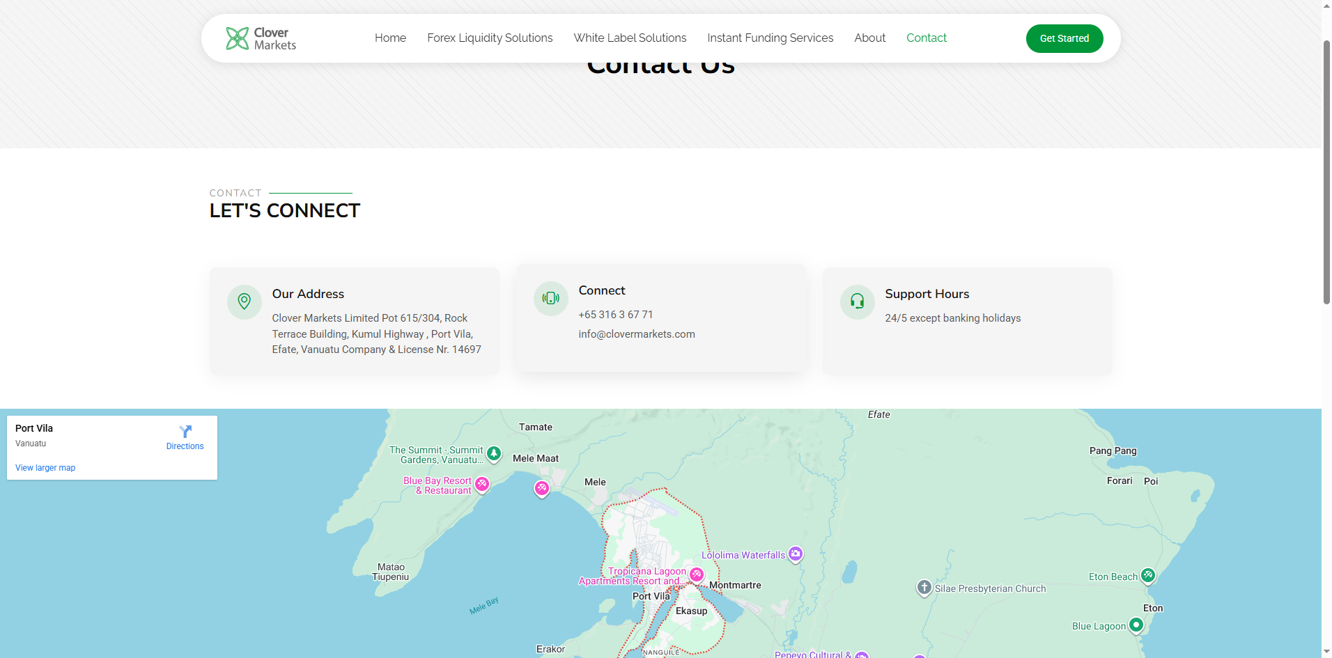 Clover Markets claims that Clover Markets Limited is authorized by the Vanuatu Financial Services Commissions(VFSC). However, our search of the official VFSC licensee register found no record of it or the stated licence. This discrepancy strongly suggests that the firm’s regulatory claims are inaccurate or deliberately misleading. Besides, VFSC does not provide any other licensing information. Until verifiable evidence of legitimate authorization is provided, we assess Clover Markets as a likely unlicensed or fraudulent broker and advise extreme caution.
