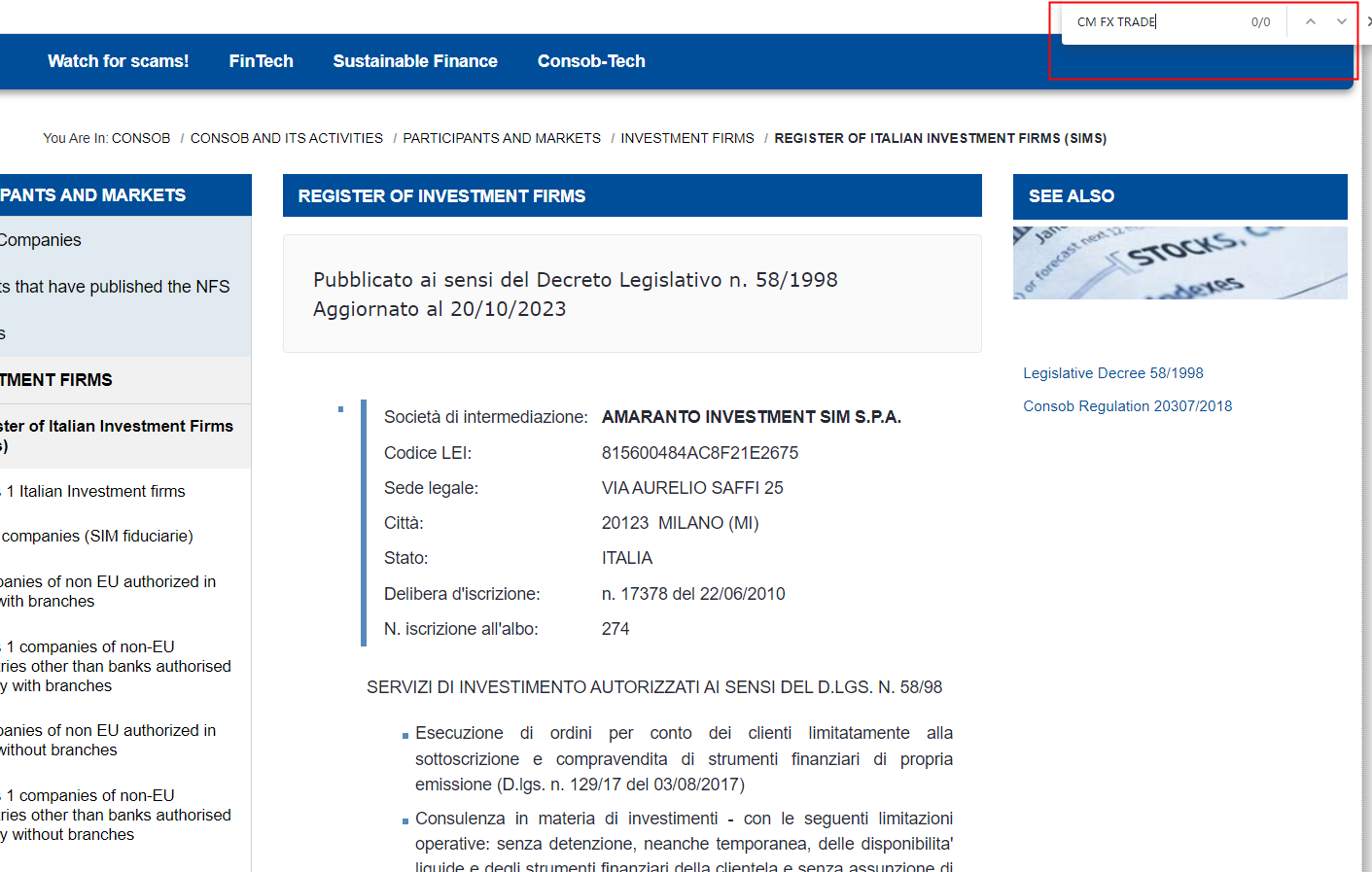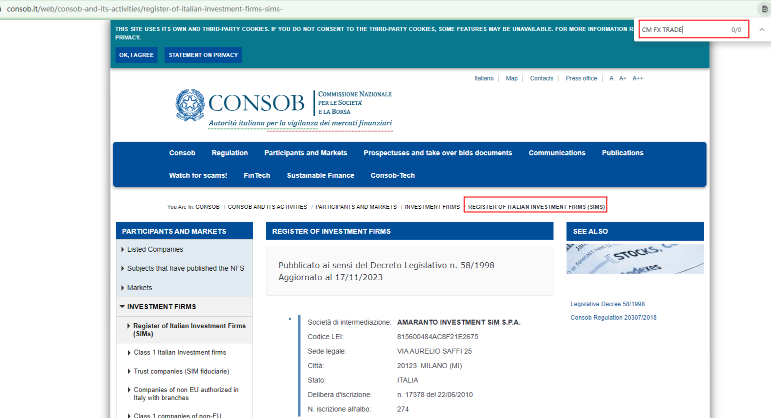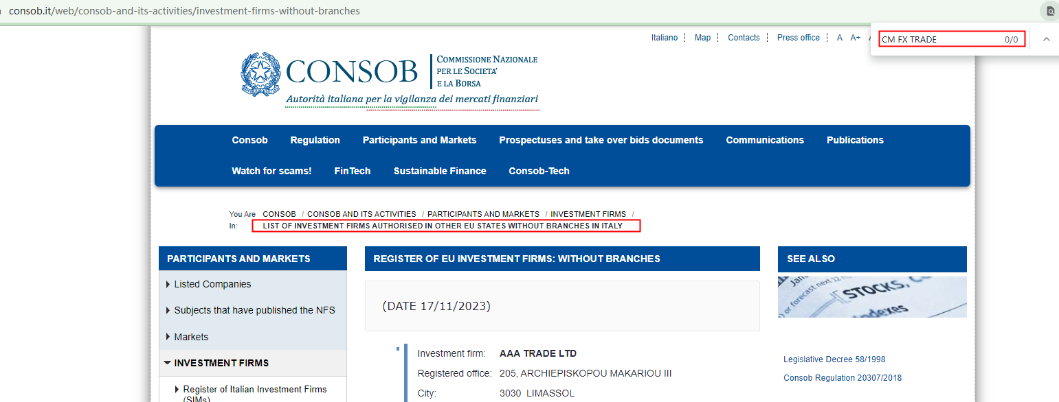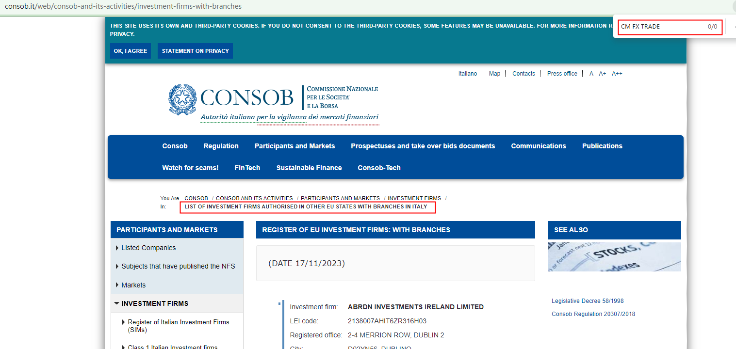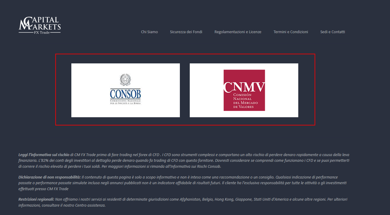 According to its website, it claims regualted by Comisión Nacional del Mercado de Valores (CNMV), upon investigation, we found that the CNMV issued a warning that CM FX TRADE was providing finacial services or products without authorisation.In addition, it claims regulated by Commissione Nazionale per le Società e la Borsa (CONSOB), but there is no matching information was found in the regulator.