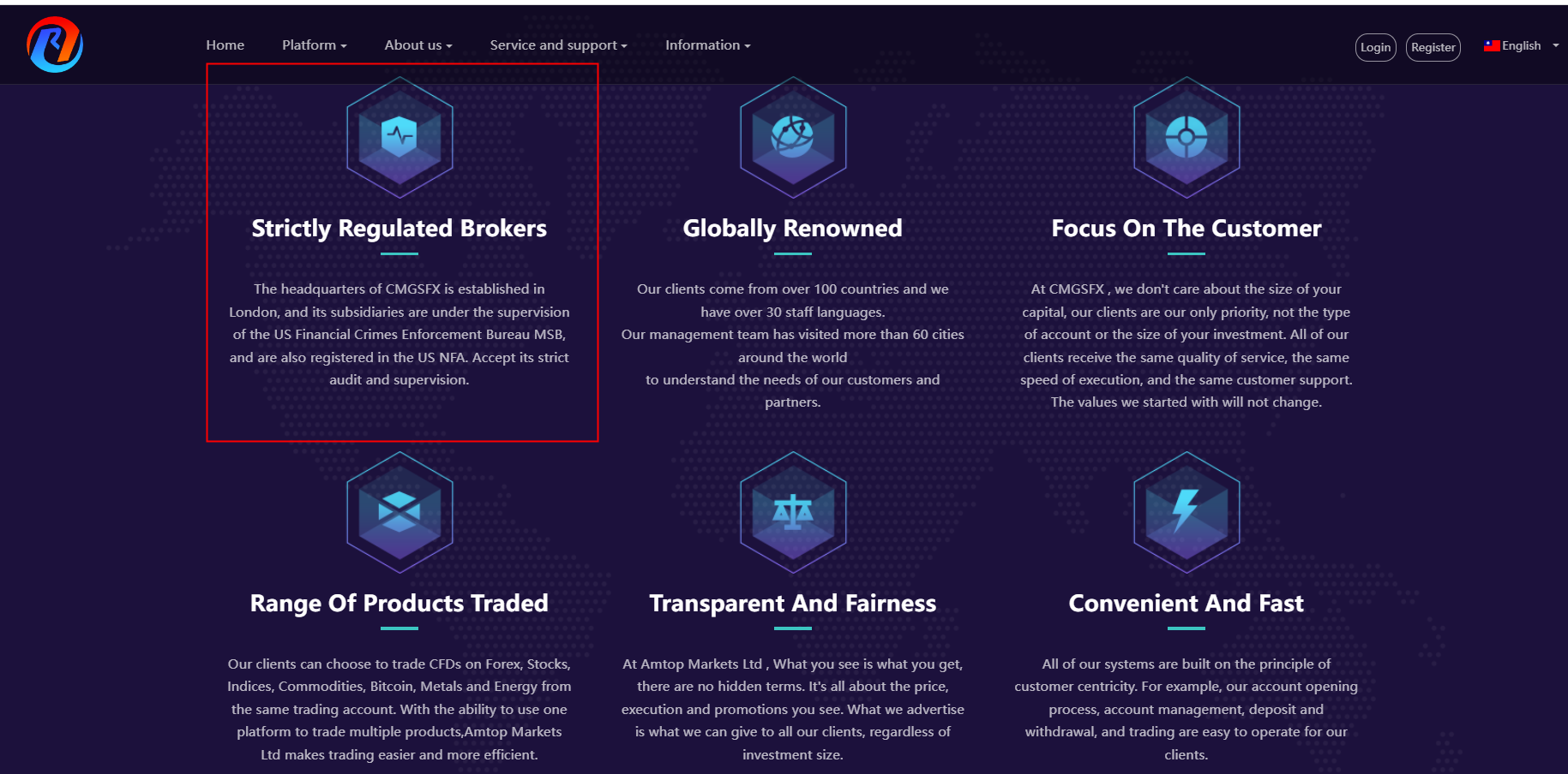According to its website, CMGSFX claims to be regulated by Financial Conduct Authority (FCA) with registration number 146311, National Futures Association (NFA) and the Financial Crimes Enforcement Network (FINCEN).While we found corresponding records in the FCA to the regulatory number, the company's name and website information linked to this FRN are different from CMGSFX's. It evident that CMGSFX has illegally copied the company's regulatory information to deceive investors. In addition, we didn't find any matching information in the NFA and FINCEN, and FINCEN is an agency that supervises money laundering and does not have the right to supervise foreign exchange.The truth is that CMGSFX is not regulated by any regulators. Letting it hold or control investors' money is unsafe, and the money can not be protected by any laws.Therefore, CMGSFX is a scam.