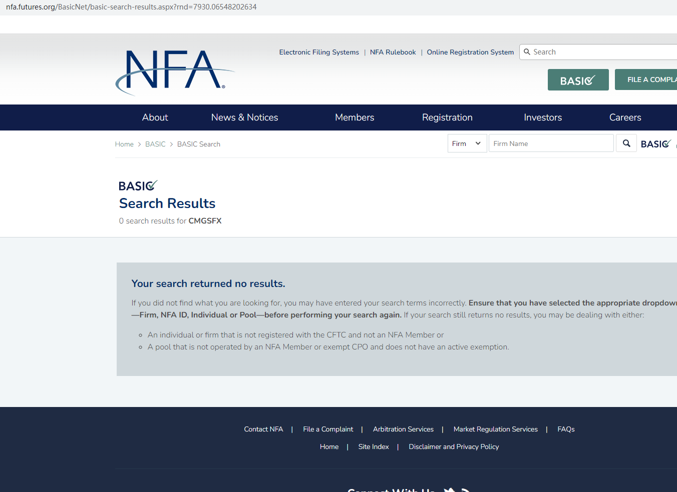 According to its website, CMGSFX claims to be regulated by Financial Conduct Authority (FCA) with registration number 146311, National Futures Association (NFA) and the Financial Crimes Enforcement Network (FINCEN).