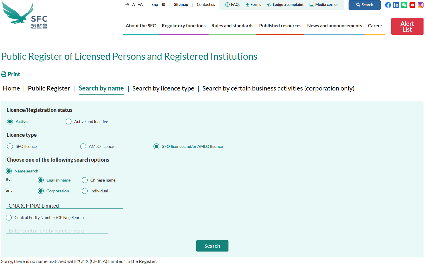 We searched the official register of the Australian Securities and Investments Commission (ASIC) and the Securities and Futures Commission (SFC) of Hong Kong using all available details, but found no record of CNX (CHINA) Limited or any associated company.