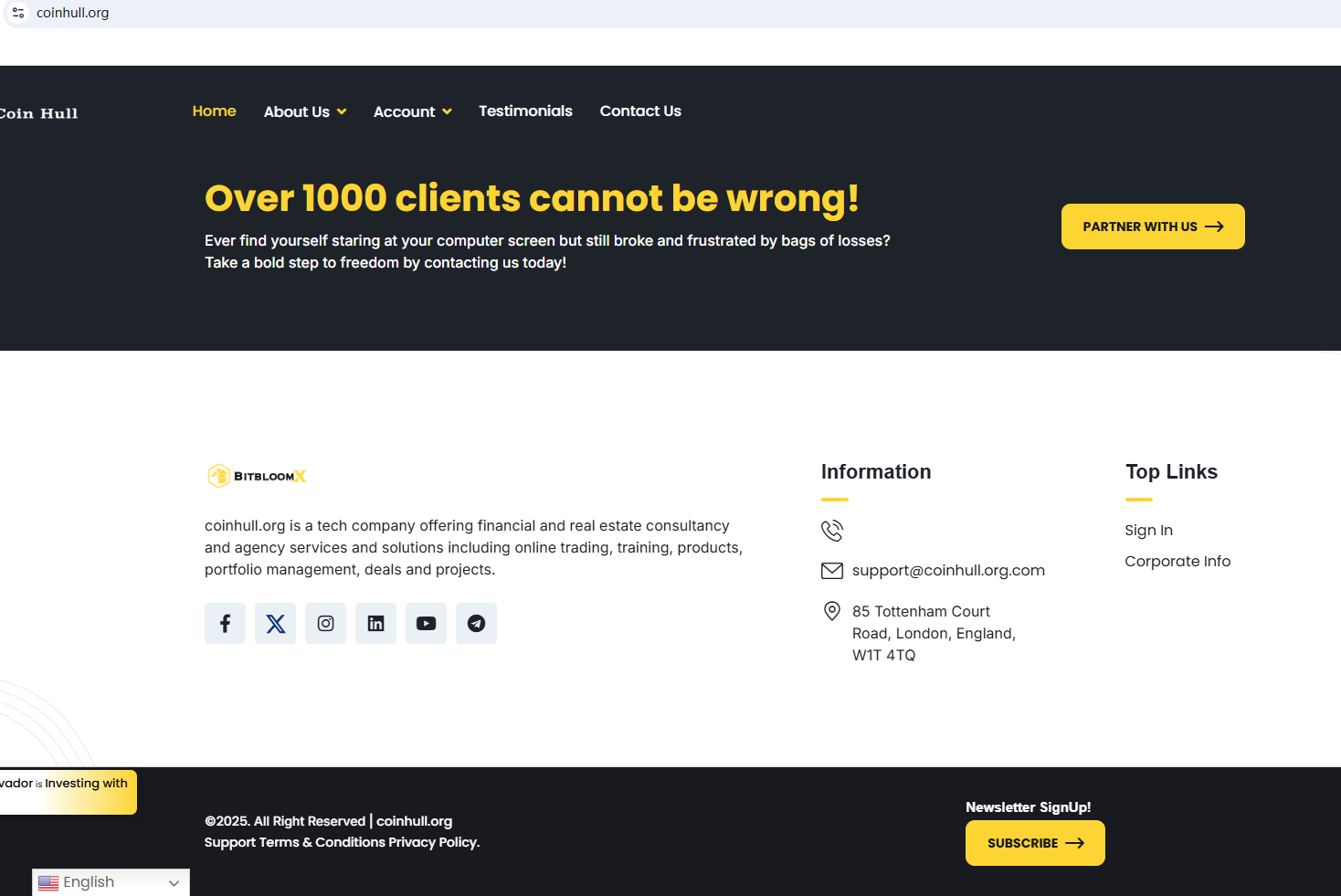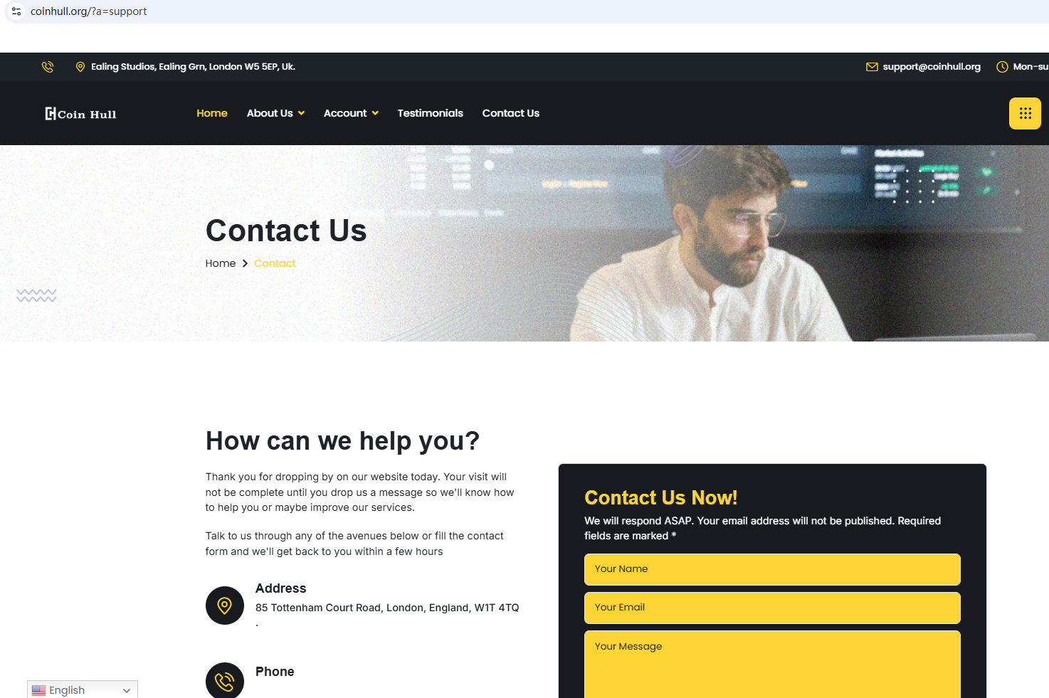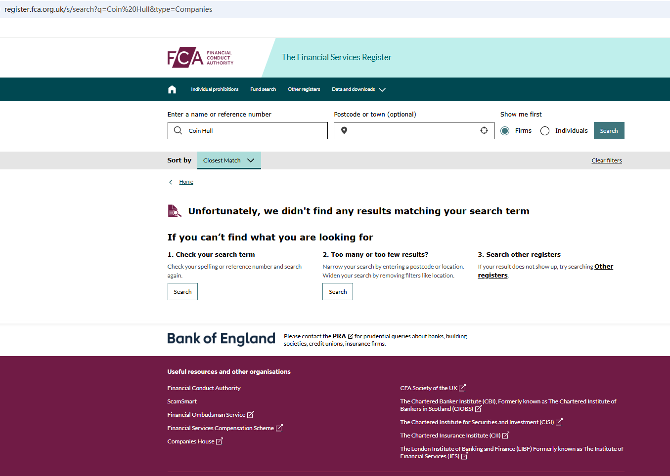 According to its website, it is located in the UK. Upon investigation, no matching information was found in the Financial Conduct Authority (FCA). In addition, the New Zealand Financial Markets Authority (NZ FMA) added Coin Hull to its warning list, stating that this is a fake investment platform.