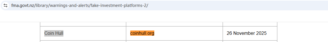 On Nov 26, 2025, the New Zealand Financial Markets Authority (NZ FMA) added Coin Hull to its warning list, stating that this is a fake investment platform. https://www.fma.govt.nz/library/warnings-and-alerts/fake-investment-platforms-2/