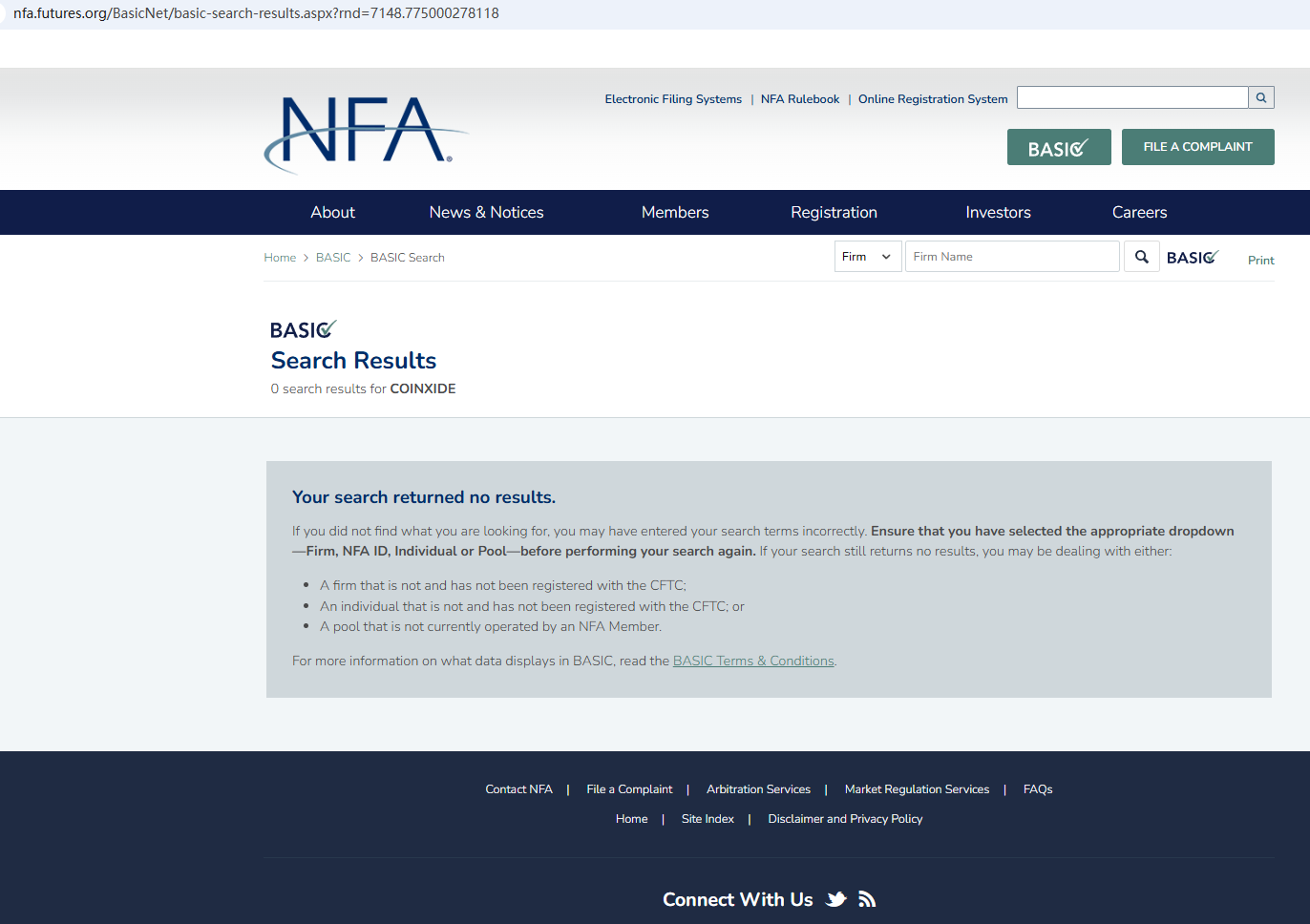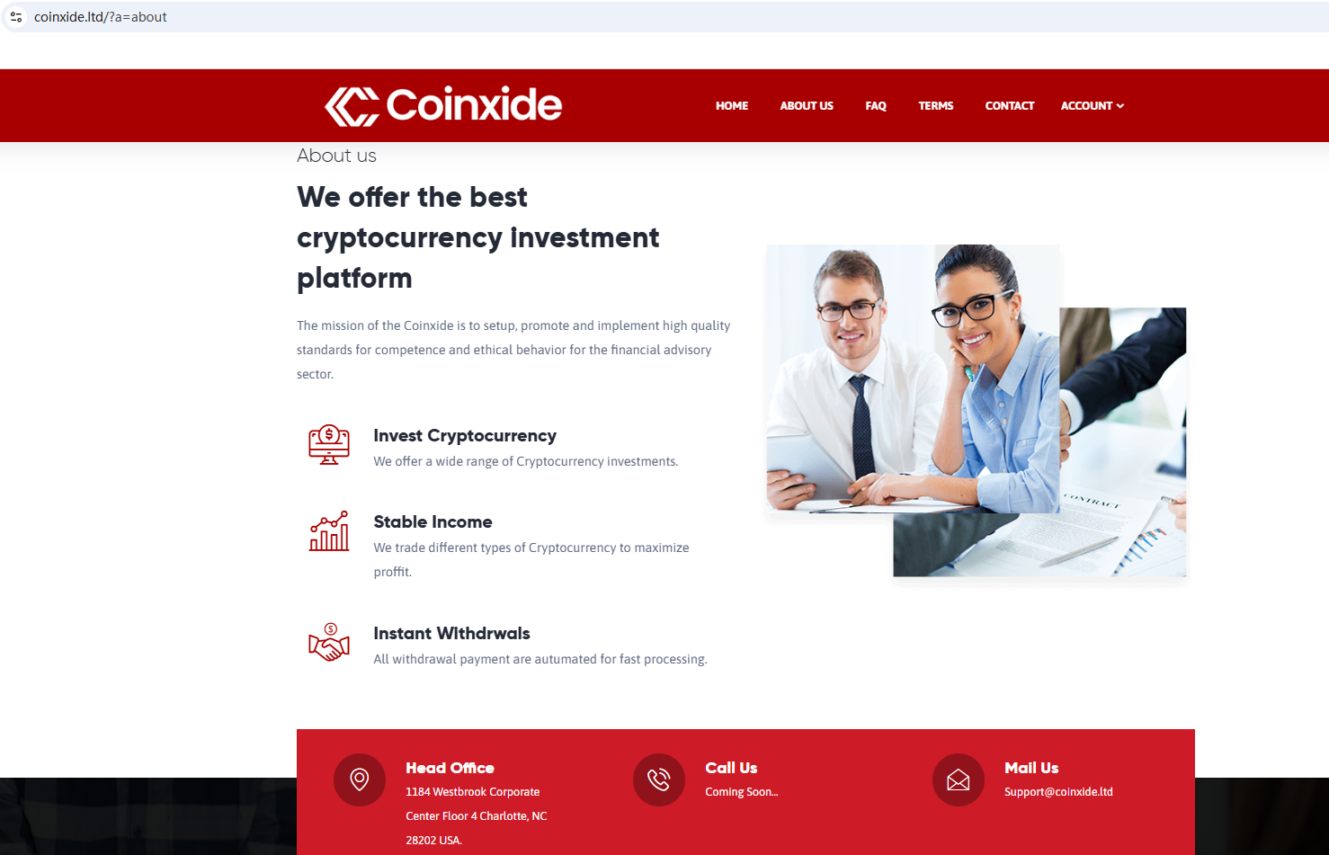 According to its website, it is located in the US. Upon investigation, no matching information was found in the National Futures Association (NFA). In addition, the New Zealand Financial Markets Authority (NZ FMA) added Coinxide to its warning list, stating that this is a fake investment platform.