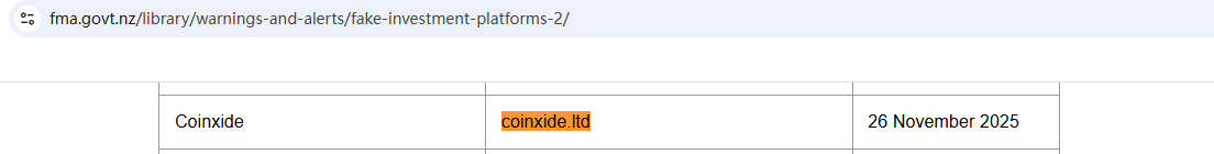 On Nov 26, 2025, the New Zealand Financial Markets Authority (NZ FMA) added Coinxide to its warning list, stating that this is a fake investment platform. https://www.fma.govt.nz/library/warnings-and-alerts/fake-investment-platforms-2/