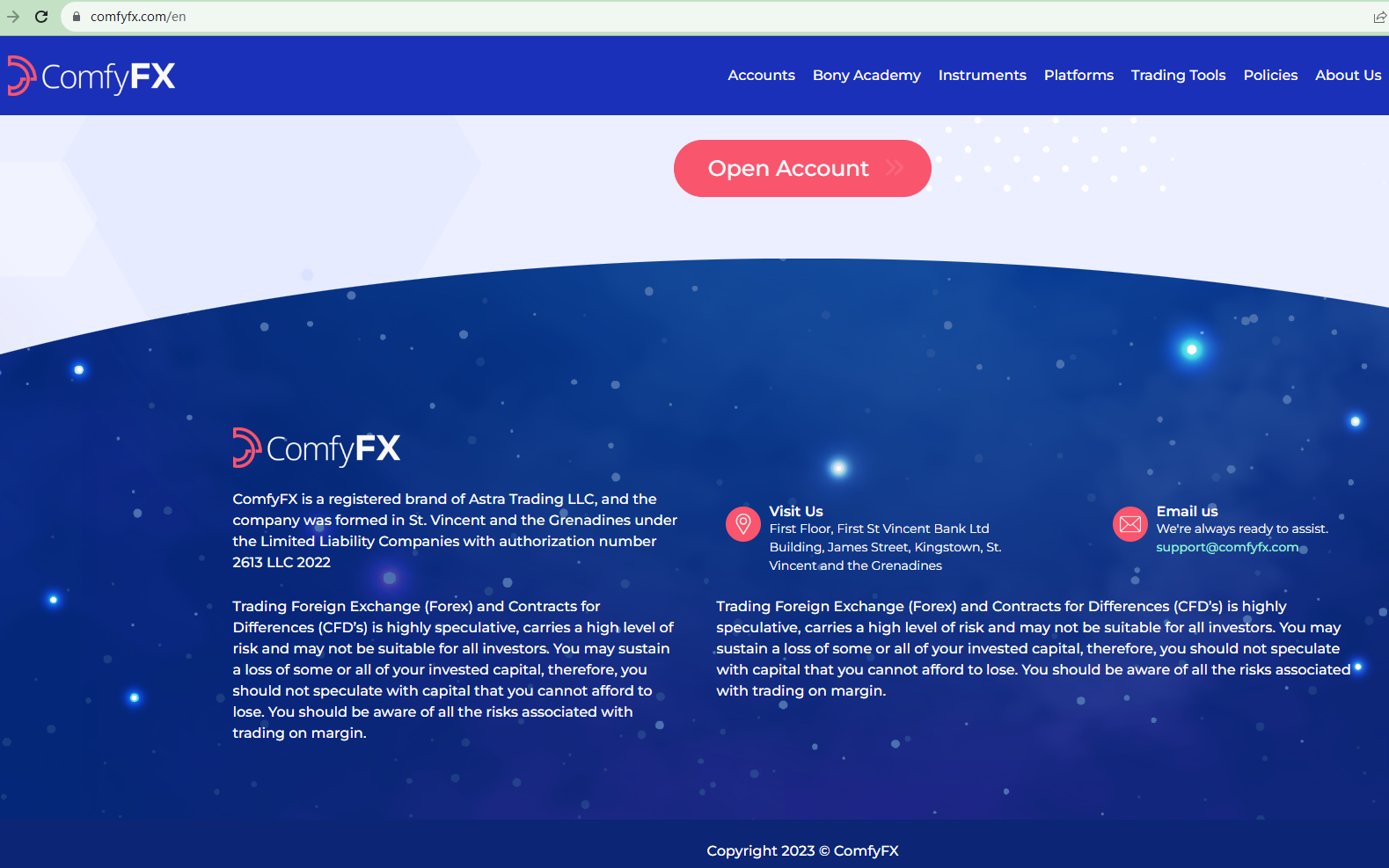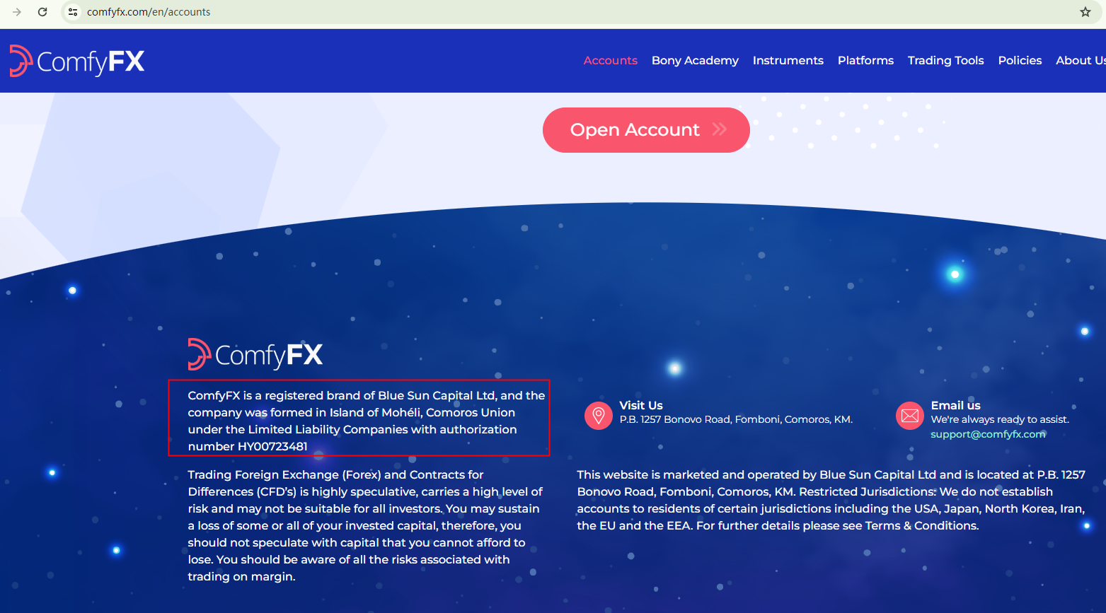 Initially, the brand claimed to be managed by Astra Trading LLC, a firm registered with the Financial Services Authority of St. Vincent and the Grenadines (SVG FSA). However, for reasons that are not clear, ComfyFX has updated its regulatory details to purport it is a "brand of Blue Sun Capital Ltd, established in the Island of Moheli, Comoros Union with authorization number HY00723481". This change casts doubt on the platform's credibility.
