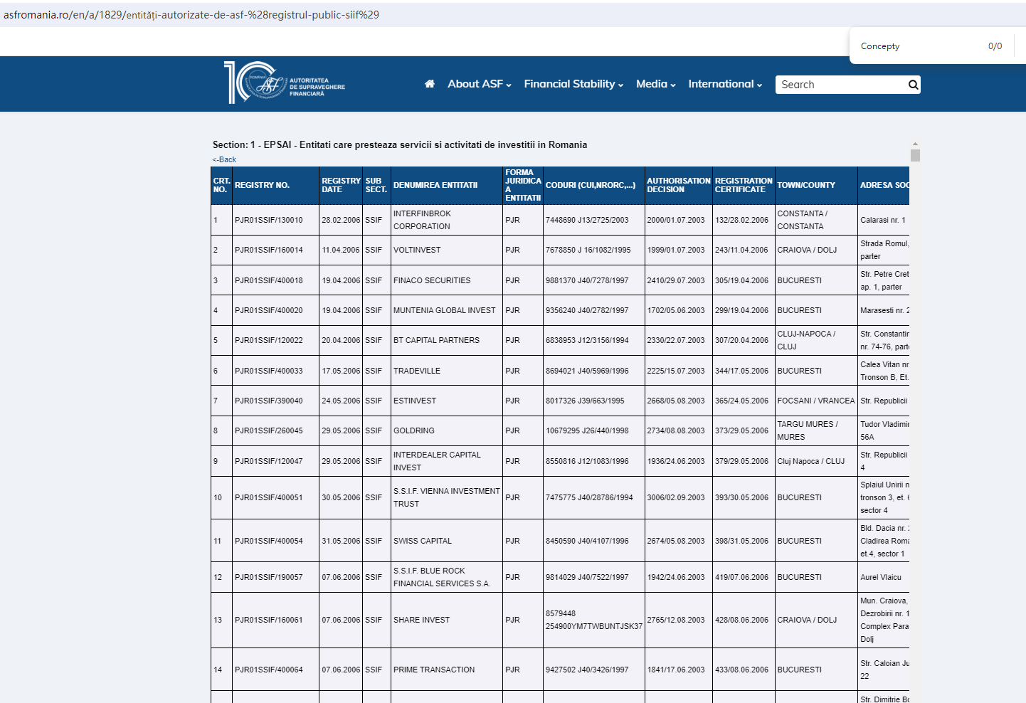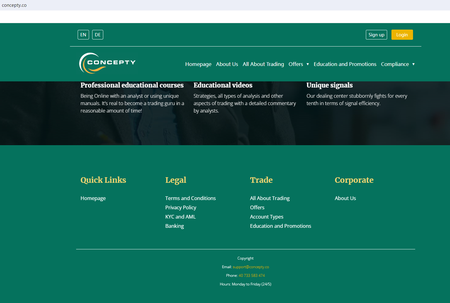 According to its website, its telephone area code is 40. After inquiry, it was found that this is the telephone area code of Romania. Upon investigation, no matching information was found in the Romania Financial Superviory Authority (ASF Romania).The truth is that Concepty is not regulated by any regulators. Letting it hold or control investors' money is unsafe and the money can not be protected by any laws.Therefore, Concepty is a scam.