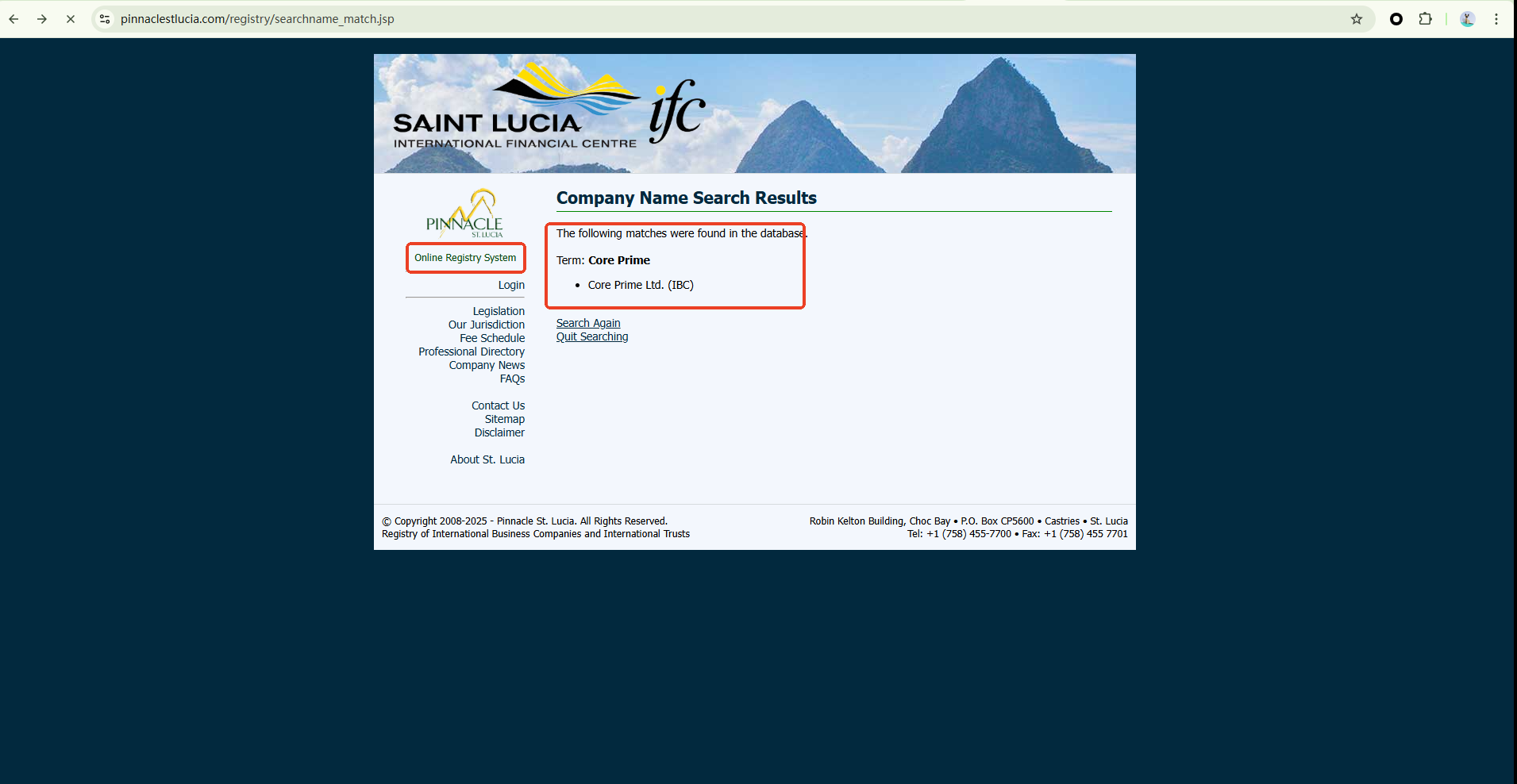 Although it claims to be highly regulated, it fails to hold any major regulatory credentials. The only relevant information we could find is that Core Prime claims to be registered and regulated by the Saint Lucia International Financial Centre (IFC). The company's name is indeed registered with the Saint Lucia IFC as an IBC company. However, the Saint Lucia IFC is an offshore jurisdiction that does not licence forex trading, meaning the company is effectively unregulated and poses a significant risk to investors.