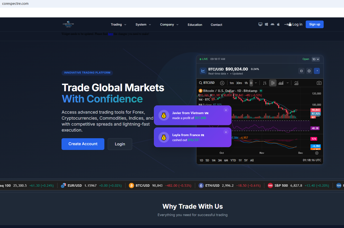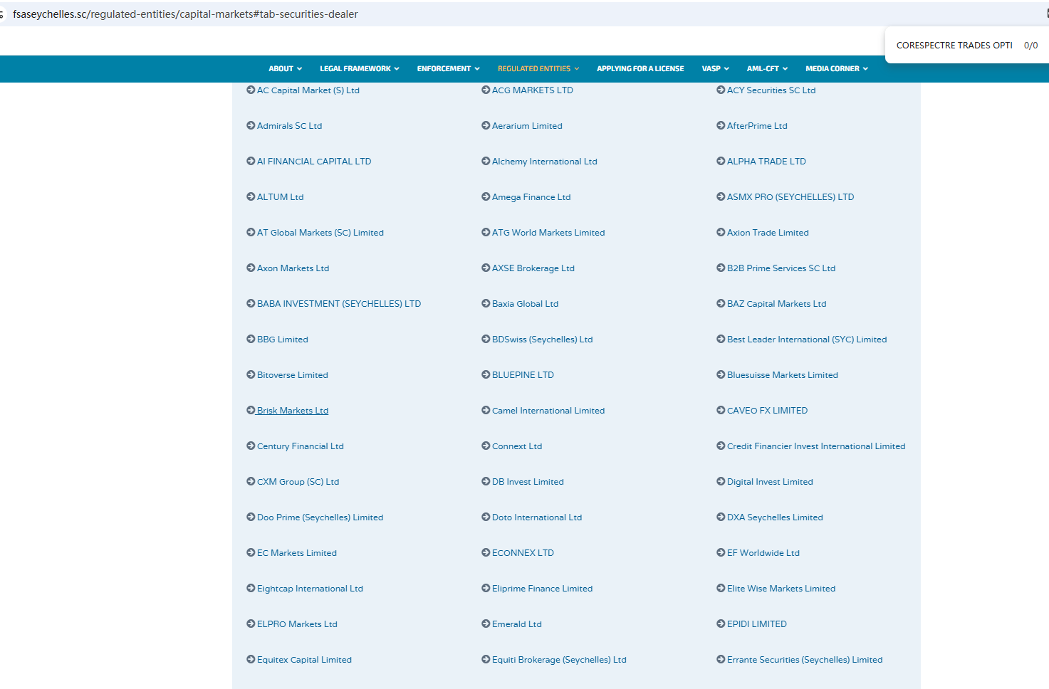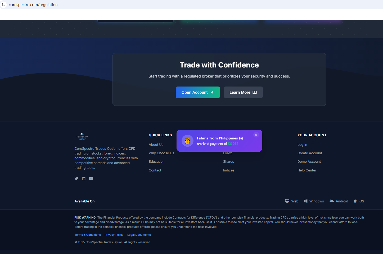 According to its website, it claims to be regulated by the Seychelles Financial Services Authority (Seychelles FSA) and the Cyprus Securities and Exchange Commission (CySEC). Upon investigation, no matching information was found in the Seychelles FSA and CySEC. In addition, the Financial Conduct Authority (FCA) issued a warning regarding CORESPECTRE TRADES OPTION, suspecting that this company may be offering financial services or products without the necessary authorization.