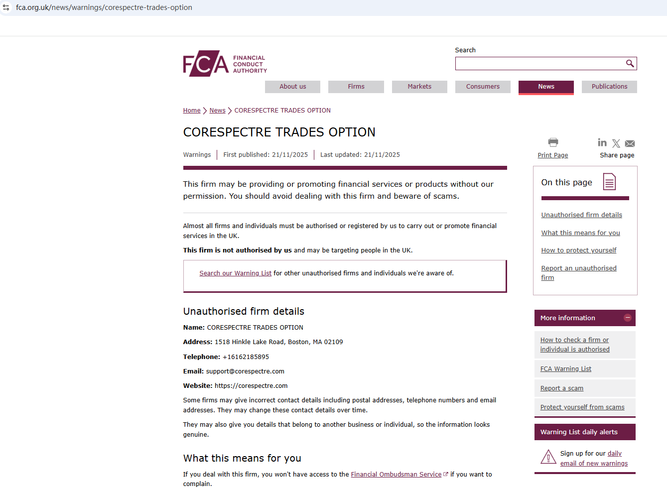 On November 21, 2025, the Financial Conduct Authority (FCA) issued a warning regarding CORESPECTRE TRADES OPTION, suspecting that this company may be offering financial services or products without the necessary authorization. https://www.fca.org.uk/news/warnings/corespectre-trades-option