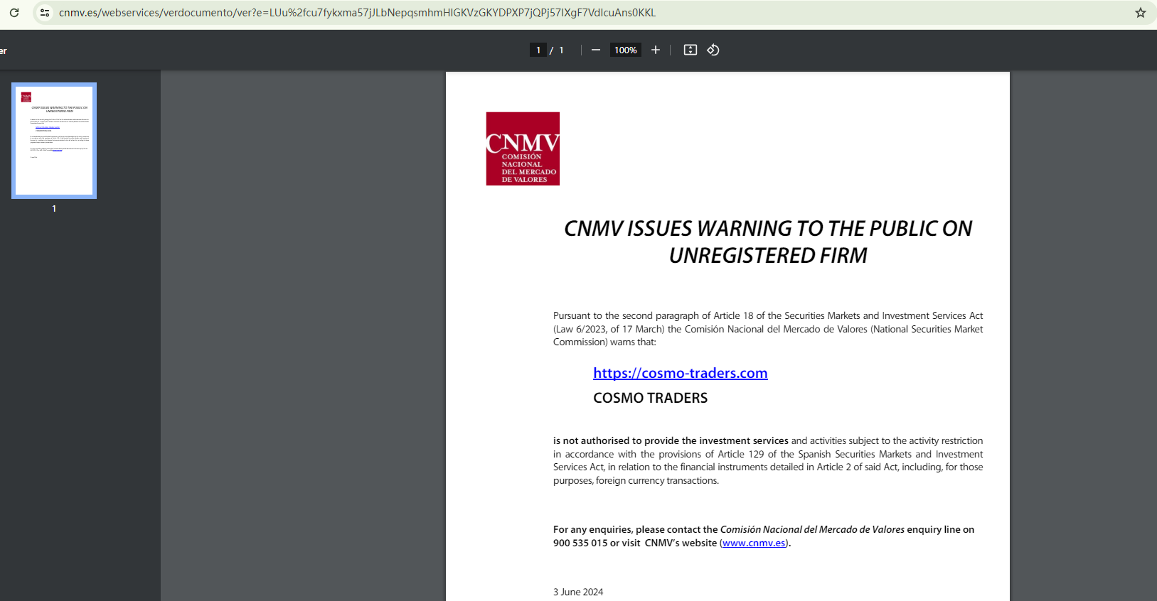 Moreover, the Comisión Nacional del Mercado de Valores (CNMV) has issued a warning about Cosmo Traders for offering investment services without proper authorization. This warning serves as a red flag, indicating that Cosmo Traders may be neglecting important financial regulations.