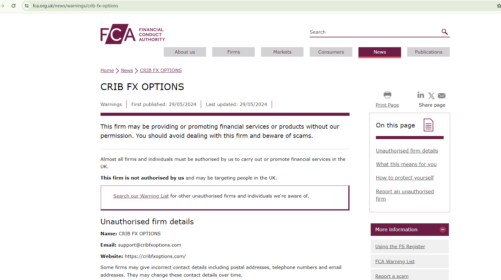 • May 28, 2024 The FCA issues a warning against CRIB FX OPTIONS