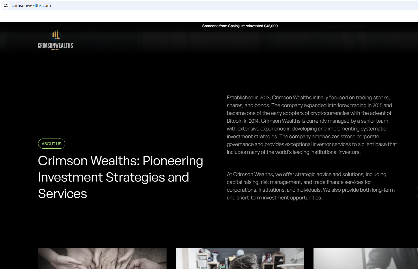 On Jan 07, 2026 the Financial Conduct Authority (FCA) issued a warning regarding Crimson Wealths, suspecting that this company may be offering financial services or products without the necessary authorization. https://www.fca.org.uk/news/warnings/crimsonwealths