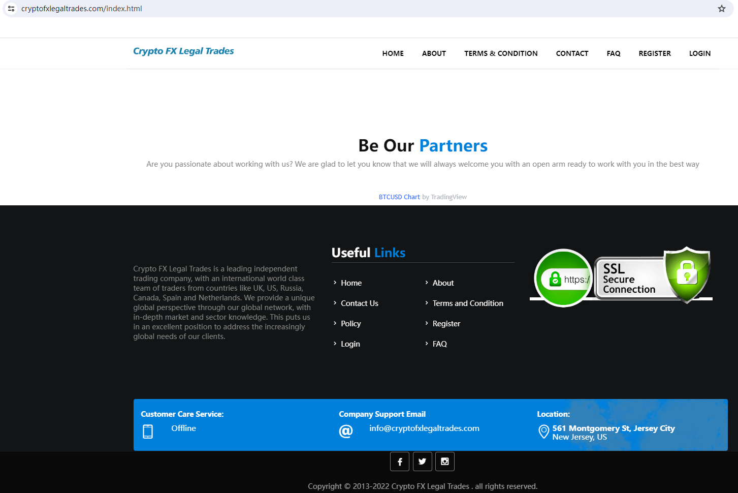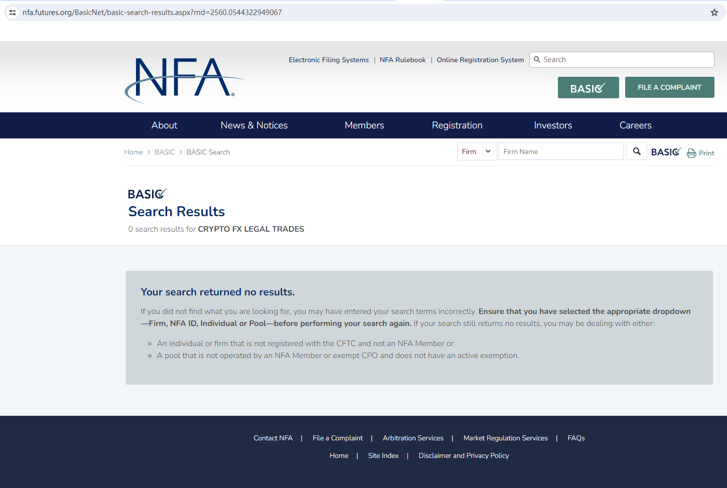 According to its website, it is located in the US. Upon investigation, no matching information was found in the National Futures Association (NFA).In essence, Crypto FX Legal Trades is not regulated by any governing body. Entrusting it with investors' funds is highly risky, as there are no legal protections in place to safeguard the funds.Crypto FX Legal Trades appears to be a scam.