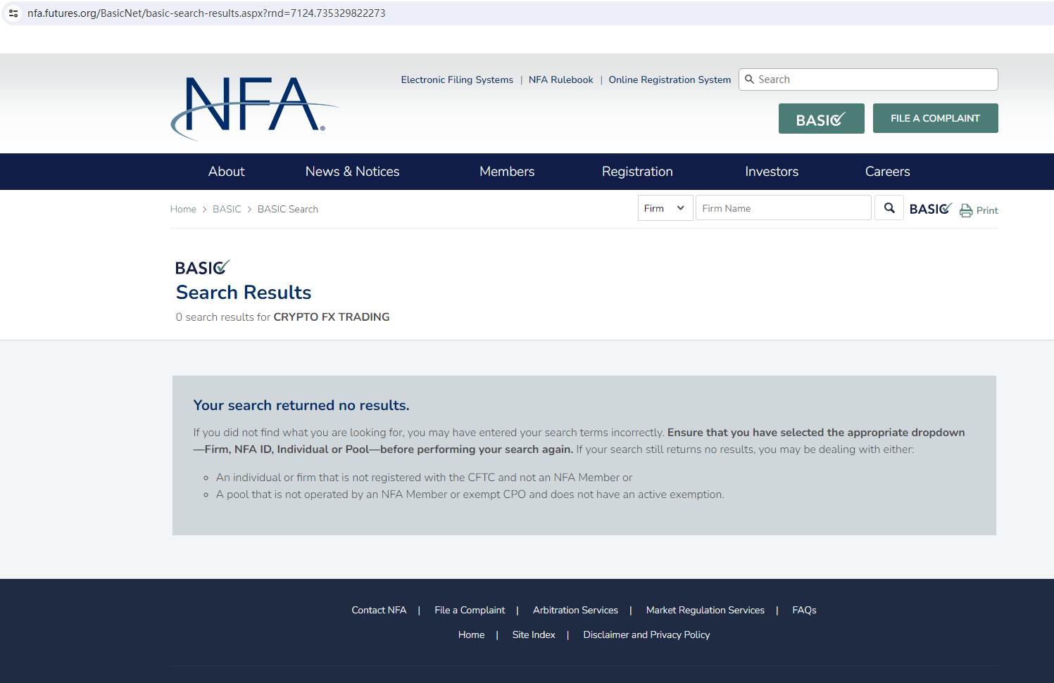 According to its website, it claims to be safe and reliable but does not display any regulatory information on its website. According to its address, it is located in the United States. Upon investigation, no matching information was found in the National Futures Association (NFA).In essence, CRYPTO FX TRADING is not regulated by any governing body. Entrusting it with investors' funds is highly risky, as there are no legal protections in place to safeguard the funds.CRYPTO FX TRADING appears to be a scam.