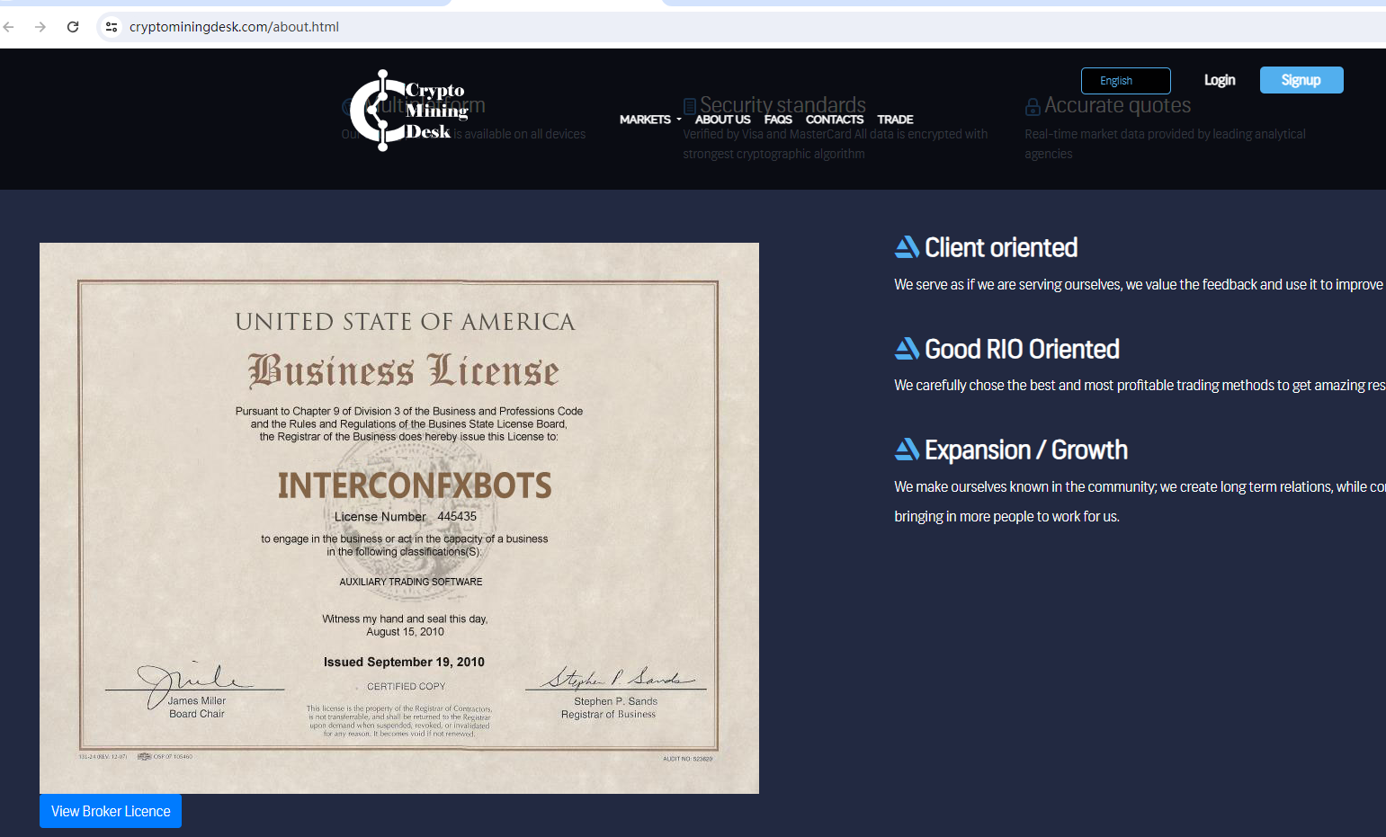 Crypto Mining Desk provided a business license in the United States by the name INTERCONFXBOTS, to operate as this type of broker in the United States, a company must be registered with the Commodity Futures Trading Commission (CFTC) and to be a member of the National Futures Association (NFA). INTERCONFXBOTS is not listed among the members of the NFA.