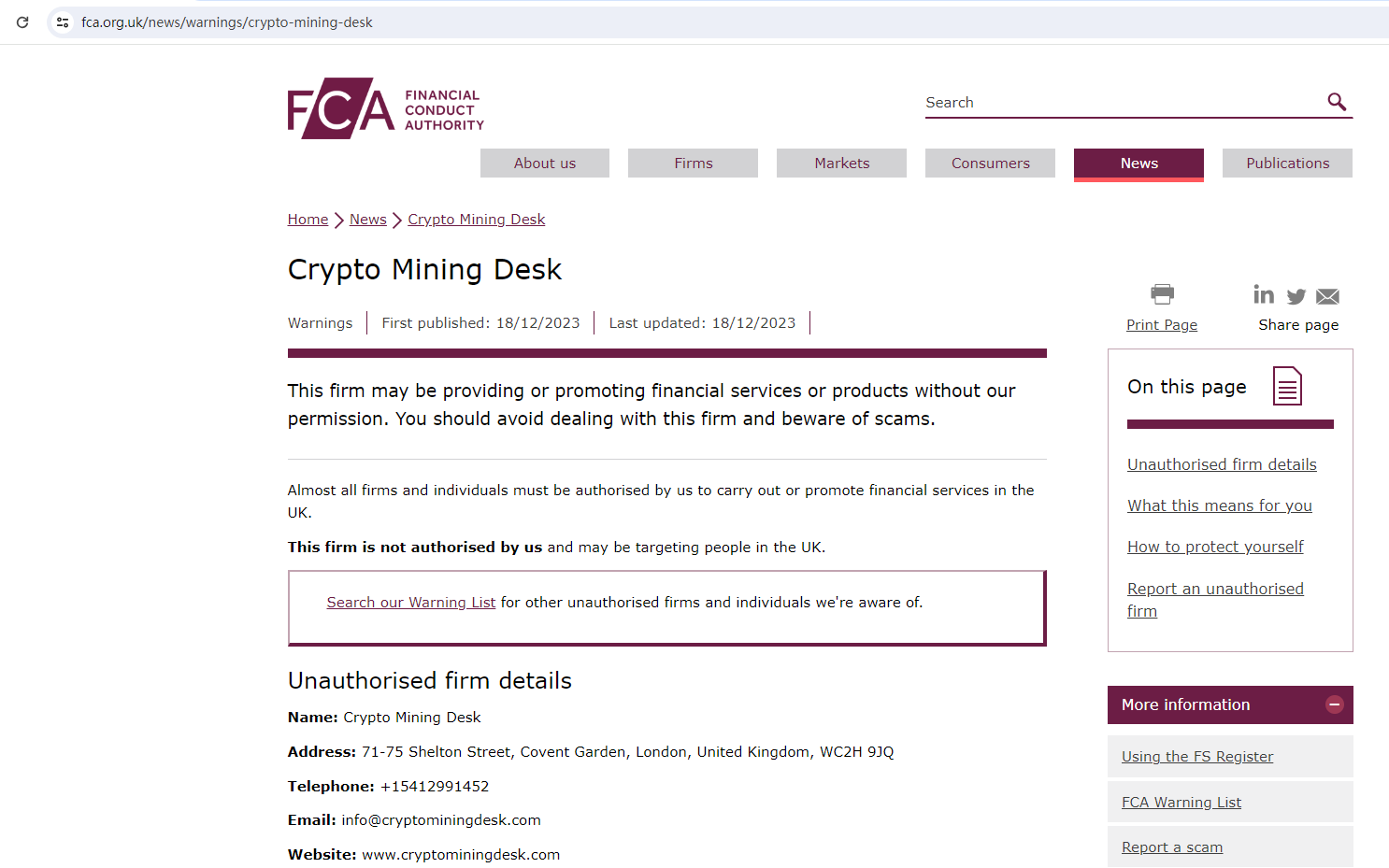Crypto Mining Desk locates in the United Kingdom, but the United Kingdom Financial Conduct Authority (UK FCA) issued a warning that Crypto Mining Desk was providing finacial services or products without authorisation.