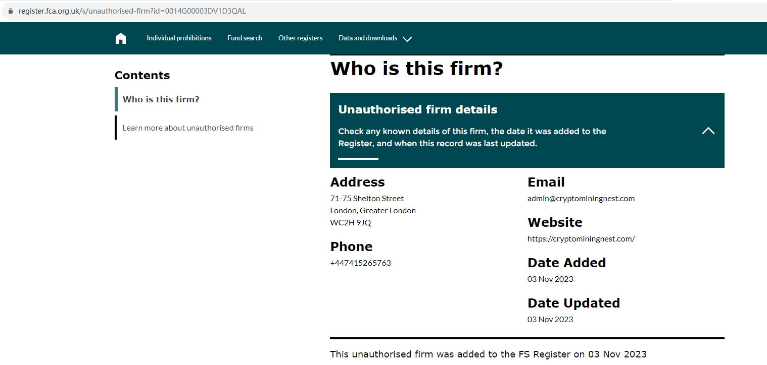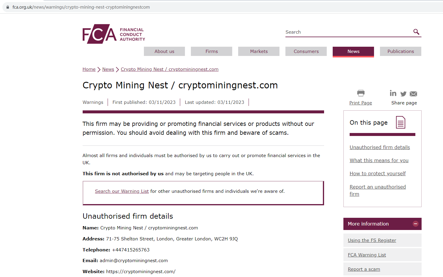 The United Kingdom Financial Conduct Authority (UK FCA) issued a warning that Crypto Mining Nest was providing finacial services or products without authorisation.