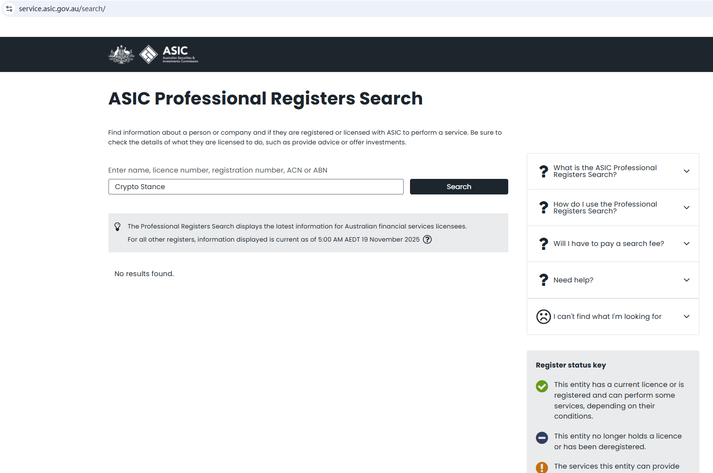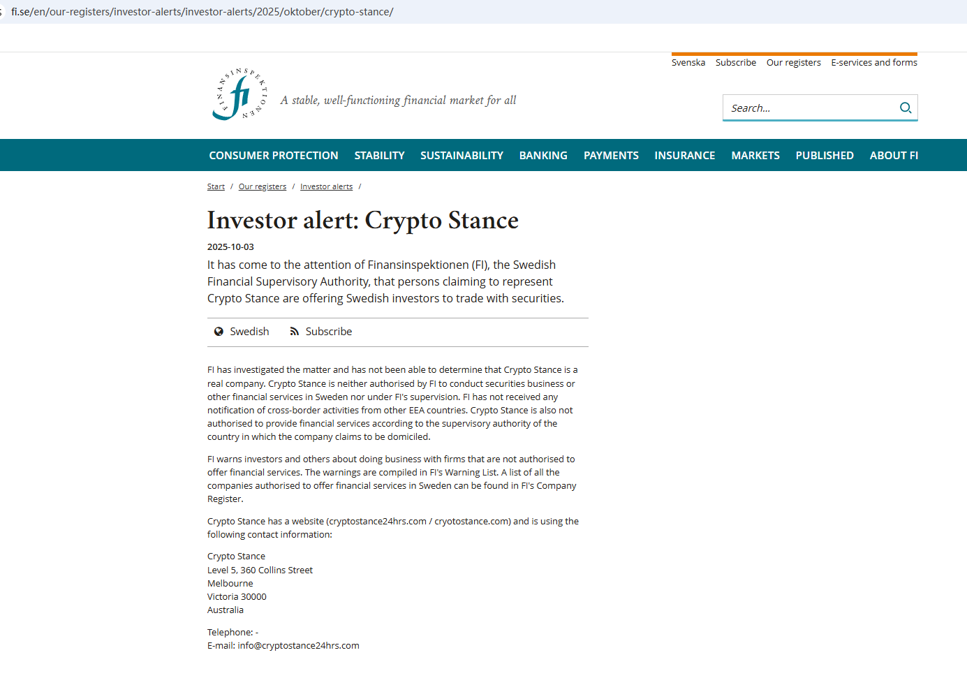 On Oct 3, 2025, the Finansinspektionen (FI) issued a warning against Crypto Stance, suspecting that it is not a real company. https://www.fi.se/en/our-registers/investor-alerts/investor-alerts/2025/oktober/crypto-stance/