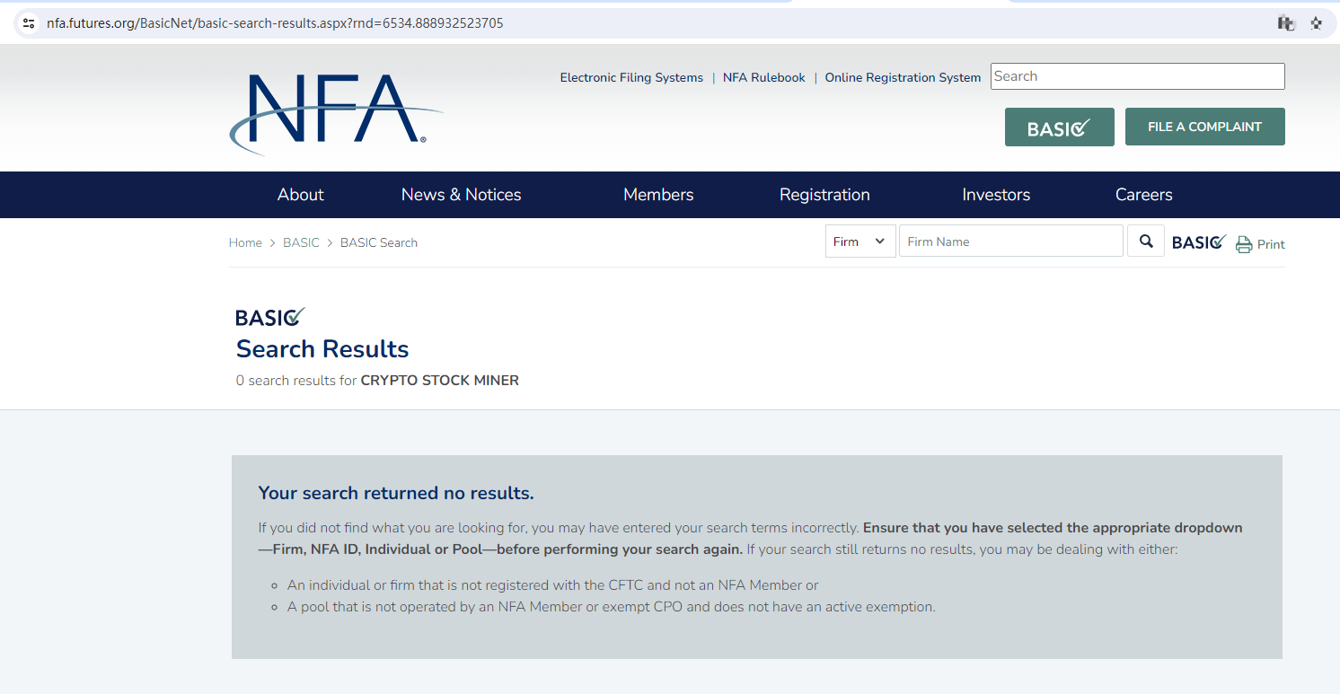 Crypto Stock miner claims to be a reliable company without presenting any information about its regulation, this broker locates in USA, but we don't find any results on National Futures Association (NFA) matching to Crypto Stock miner.