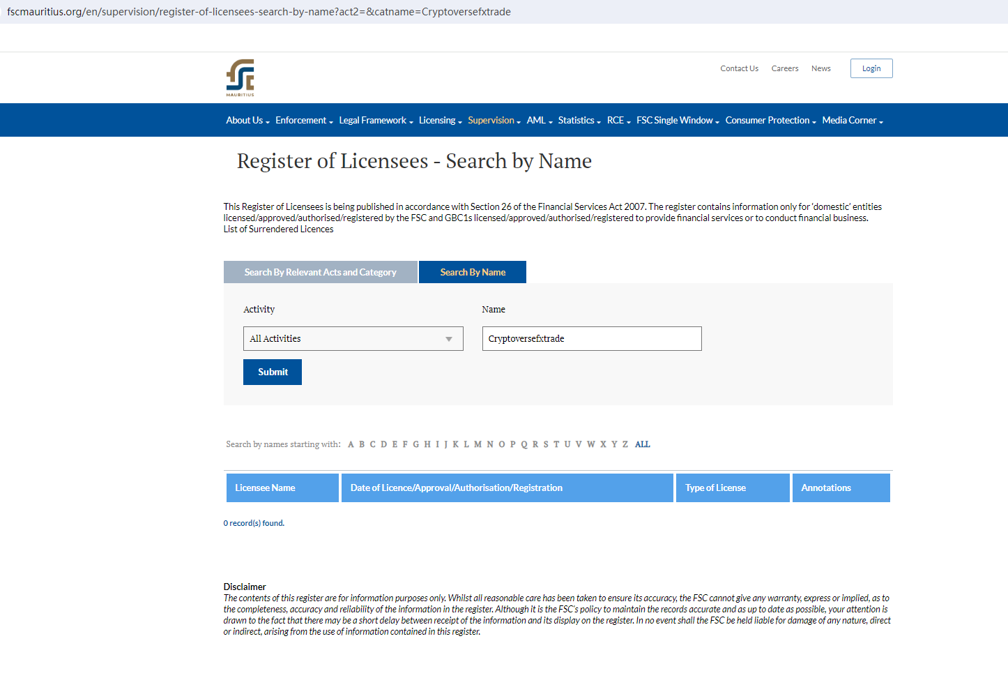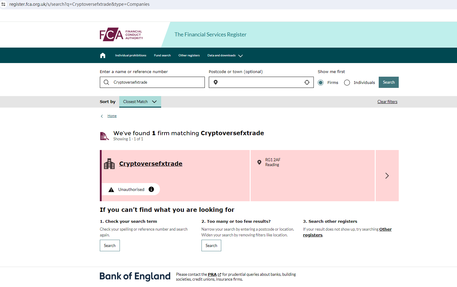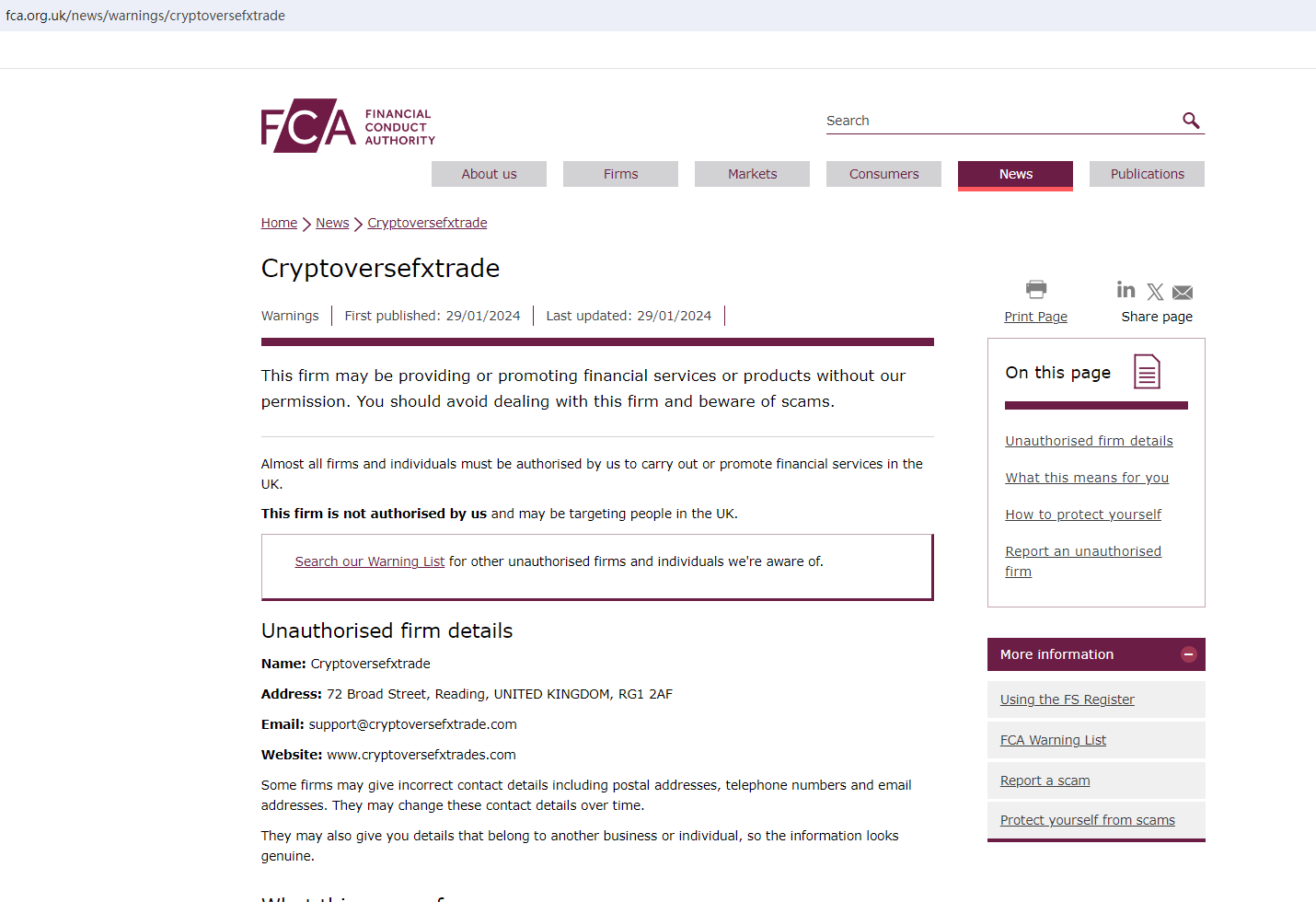 According to its website, it is located in the United States, and it also claims to be regulated by the Cyprus Securities and Exchange Commission (CySEC), the Financial Services Commission, Mauritius (Mauritius FSC), and Securities Exchange Commission (FSC). However, upon investigation, no matching information was found. In addition, it claimed to be registered with the Financial Commission, but no matching information was found.Furthermore, it claimed to be supervised by the Financial Conduct Authority (FCA). Upon investigation, it was found that the FCA had not authorized it, and the Financial Conduct Authority (FCA) issued a warning against Cryptoversefxtrade, believing this broker might be providing financial services or products without proper authorization.In essence, Cryptoversefxtrade is not regulated by any governing body. Entrusting this broker with investors' funds is highly risky, as there are no legal protections in place to safeguard the funds. Cryptoversefxtrade is unequivocally a scam.