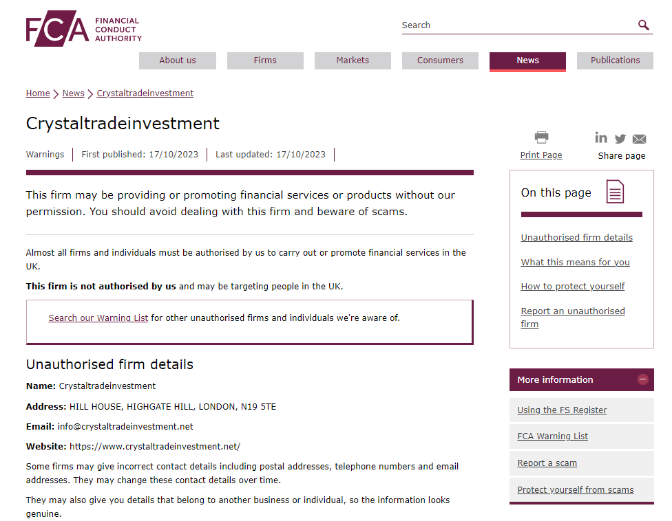 In addition, it is located in UK. However, upon investigation, the United Kingdom Financial Conduct Authority (UK FCA) issued a warning that Crystaltradeinvestment was providing finacial services or products without authorisation.