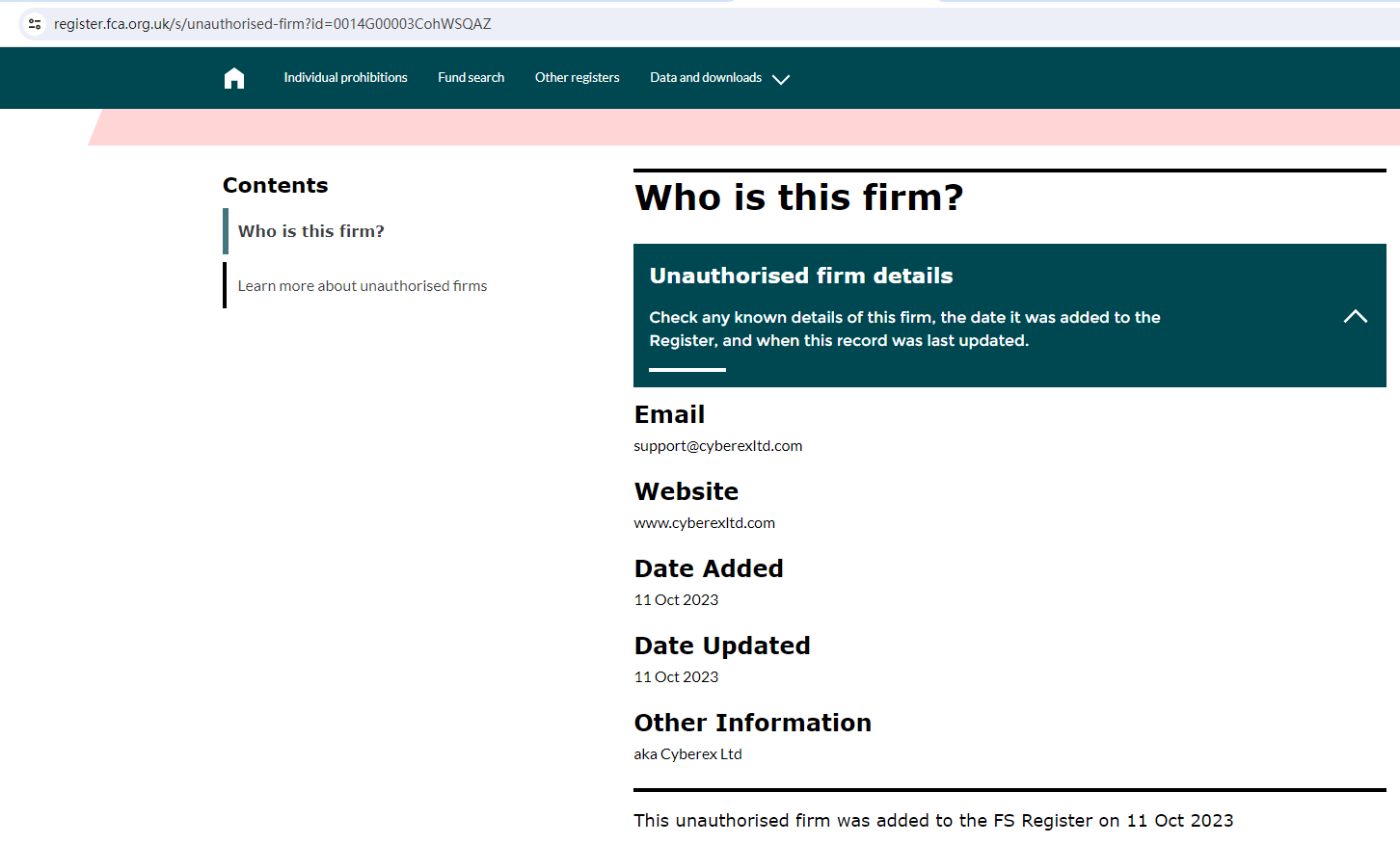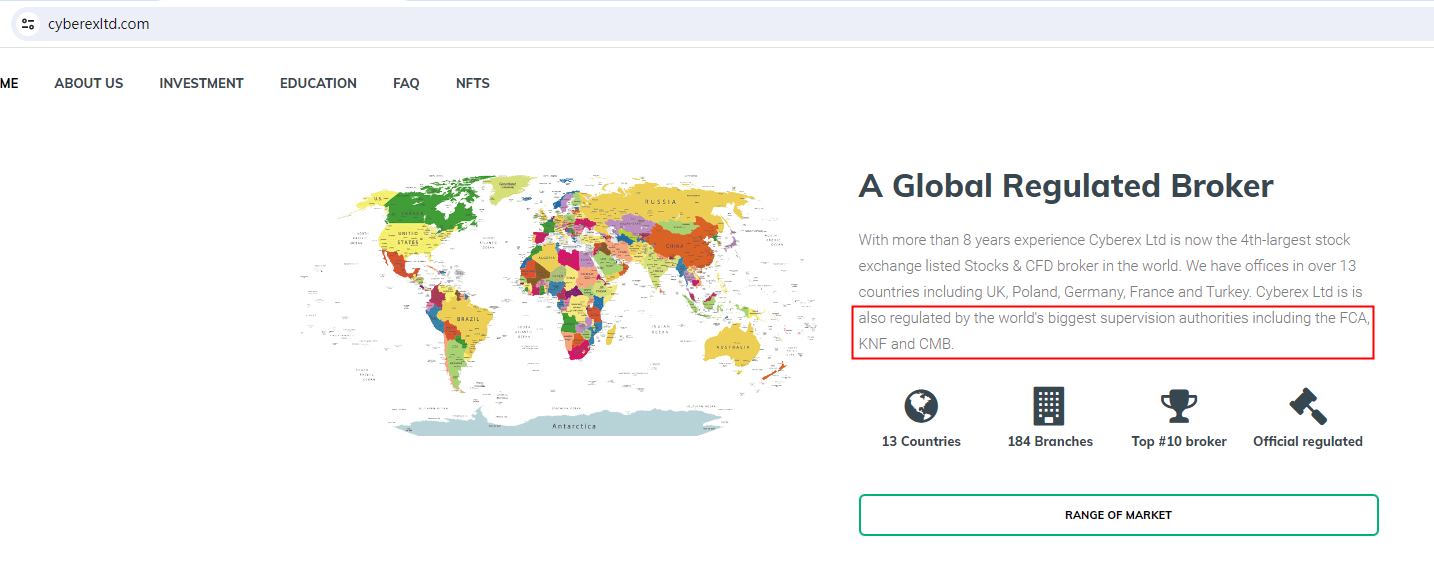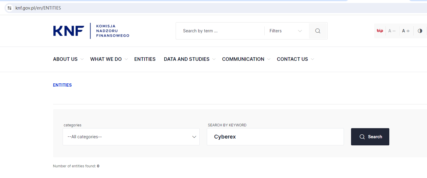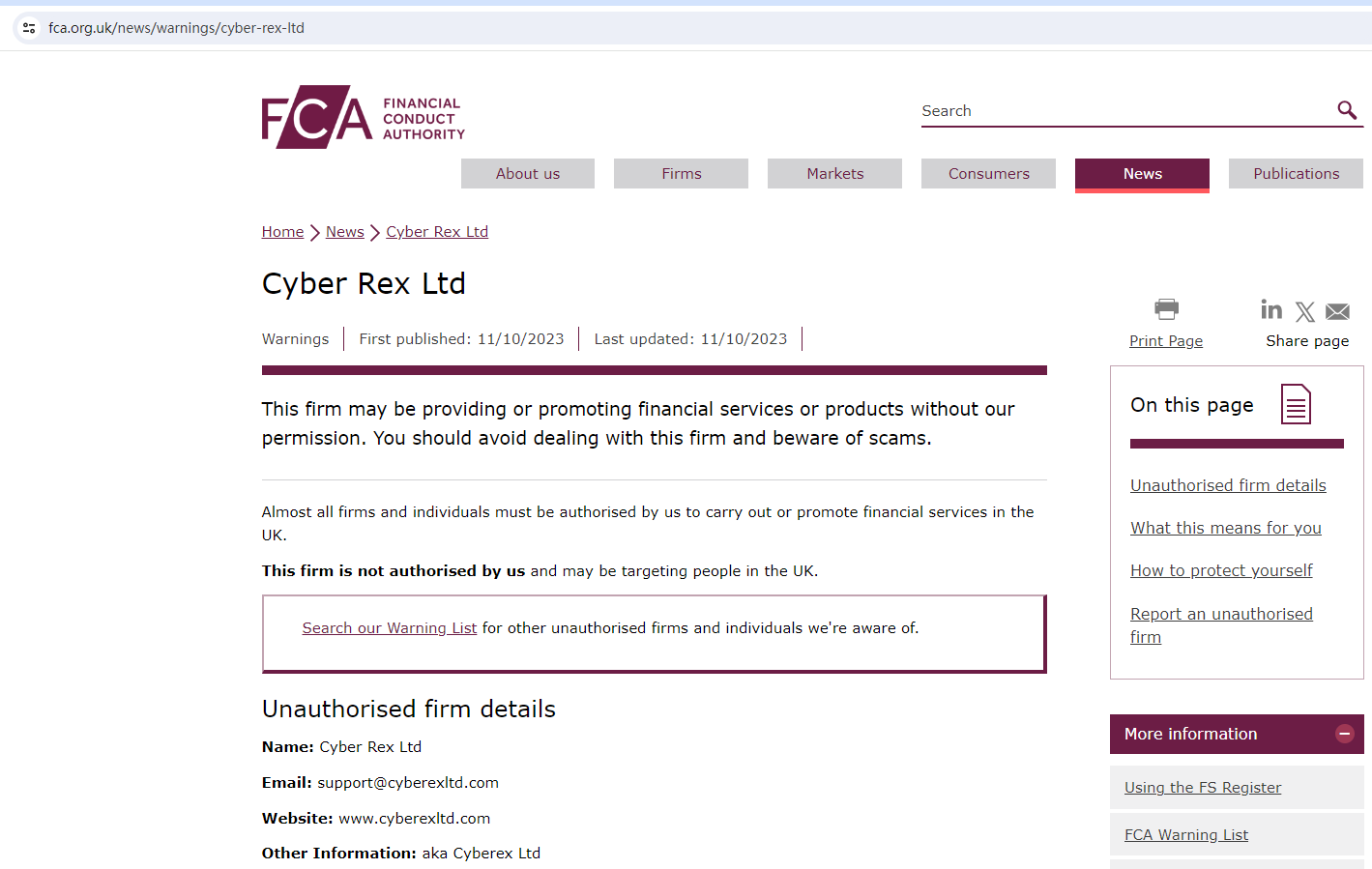 CYBER REX claims to be regulated by the United Kingdom Financial Conduct Authority (UK FCA), the Polish Financial Supervision Authority (KNF) and the Capital Markets Board of Turkey (CMB), we searched the FCA but found it was unauthorised, while there were no matching results on KNF and CMB.