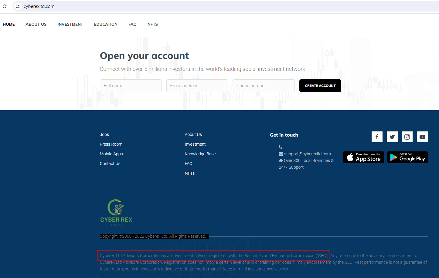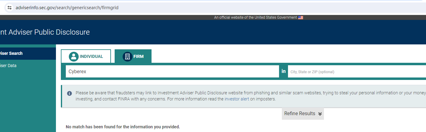 CYBER REX also claims to be registered with the Securities and Exchange Commission (SEC), we searched the SEC but found no matching results.