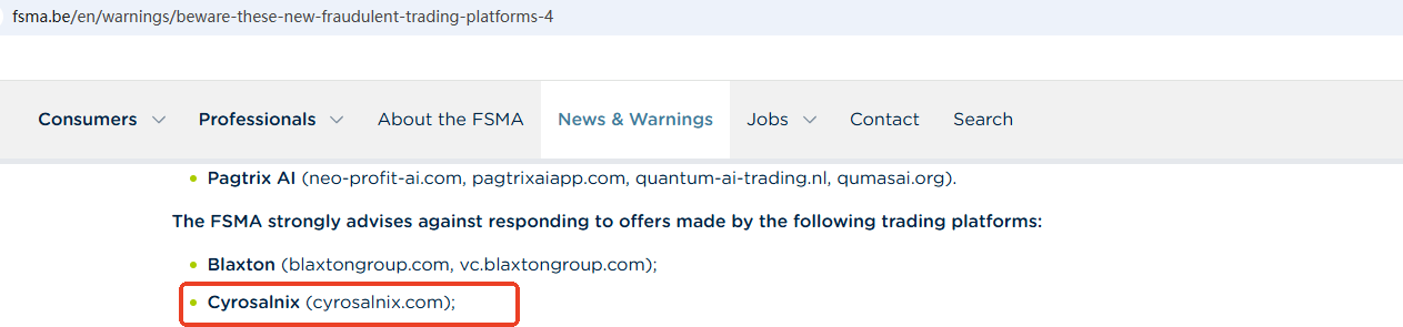 On March 12, 2026, the Financial Services and Markets Authority (FSMA) issued a warning about Cyrosalnix for the lack of the required authorization. https://www.fsma.be/en/warnings/beware-these-new-fraudulent-trading-platforms-4