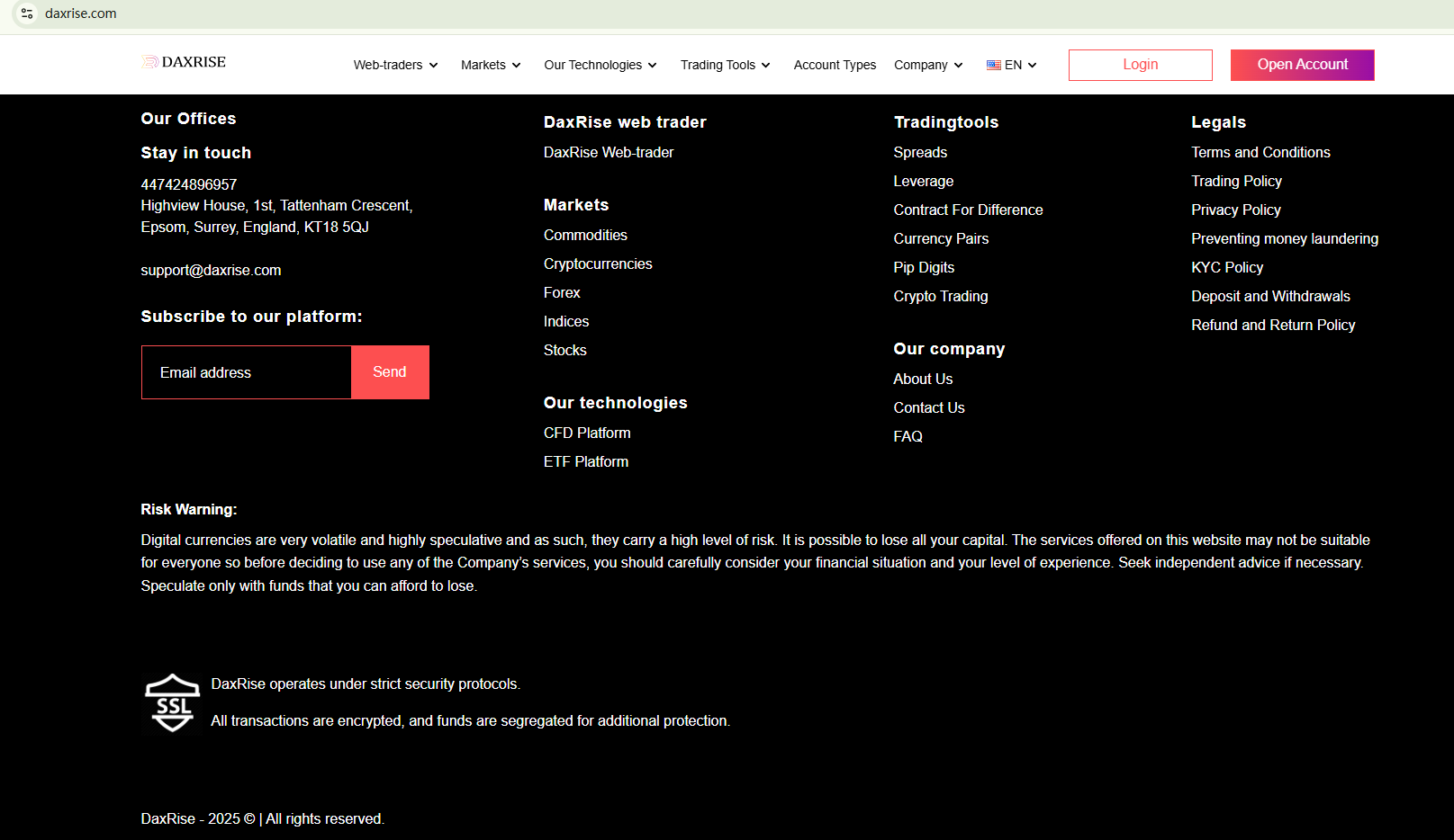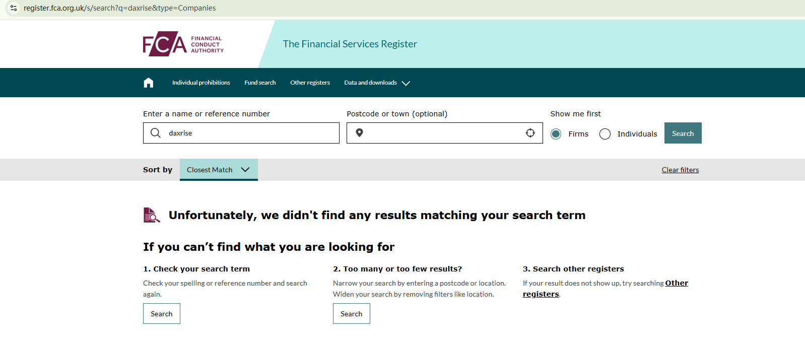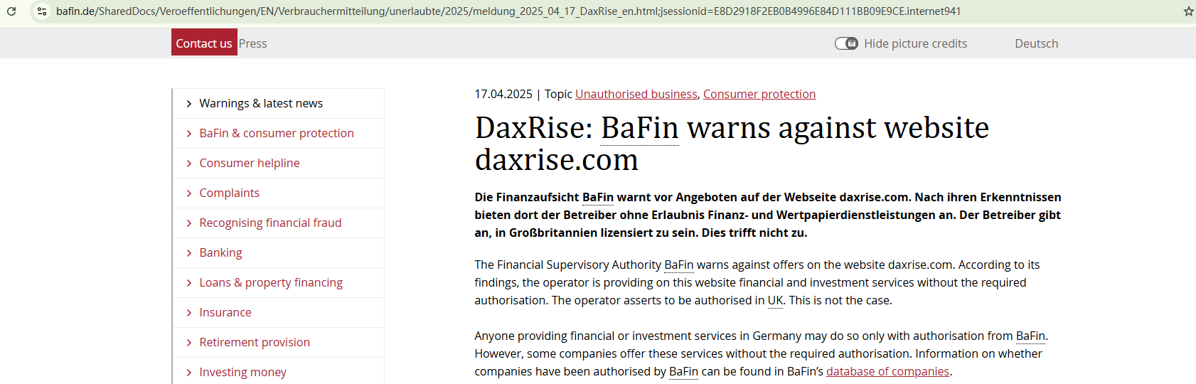 DaxRise claims to be domiciled in the UK, but there are no indications that it is registered with the Financial Conduct Authority (FCA). The Federal Financial Supervisory Authority (BaFin) has also noted this suspicious investment website and issued a warning, clearly stating that DaxRise is operating without the license.