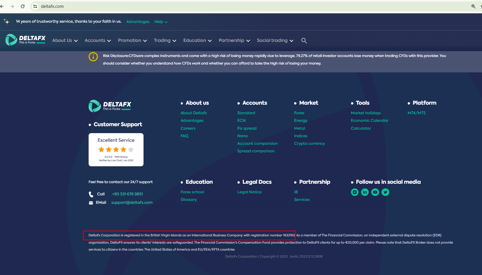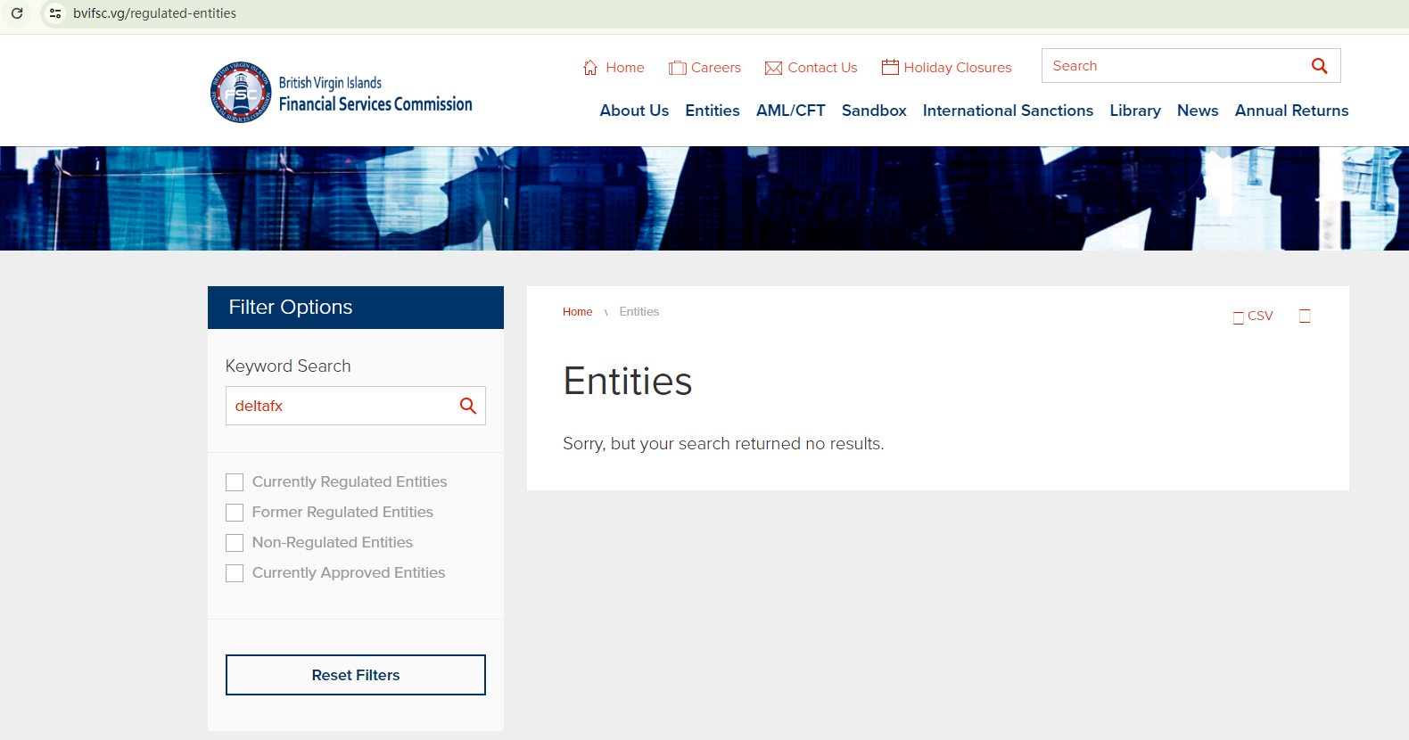 Deltafx purports to be registered in the British Virgin Islands. However, our search in the Financial Services Commission of the BVI (BVI FSC) registry yielded no matching results for this company.