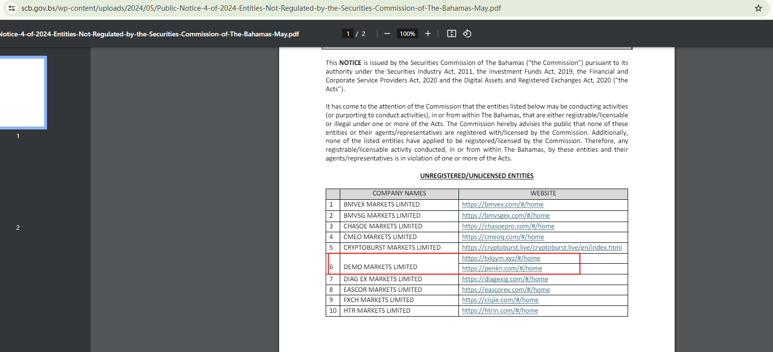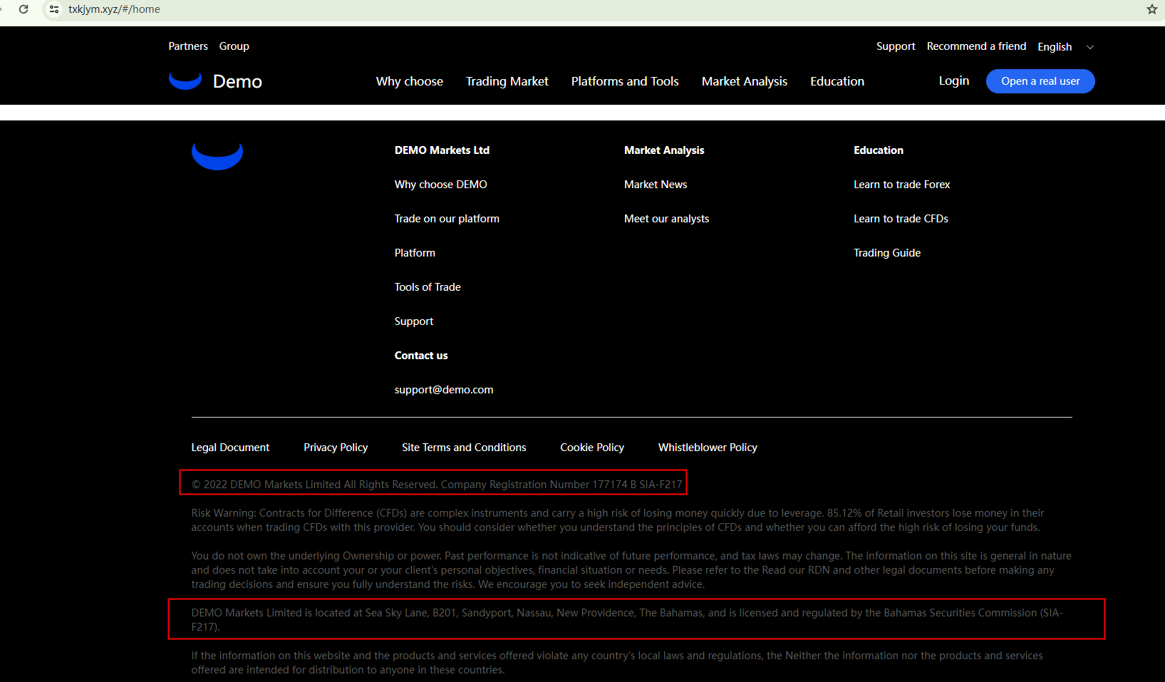 DEMO offers financial services through two websites: txkjym.xyz and penkn.com. The former was registered in April 2024 and the latter in August 2023. However, this brand asserts that it was founded in 2010 and has won awards since 2016. The discrepancy between these claims and the actual website registration dates raises a red flag.Furthermore, while DEMO claims to be registered with the Securities Commission of the Bahamas (SCB), the SCB has added the broker to its warning list, refuting such a claim. This suggests that DEMO is not only unregulated but also potentially fraudulent.In essence, DEMO is not regulated by any governing body. Entrusting it with investors' funds is highly risky, as there are no legal protections in place to safeguard the funds.DEMO appears to be a scam.