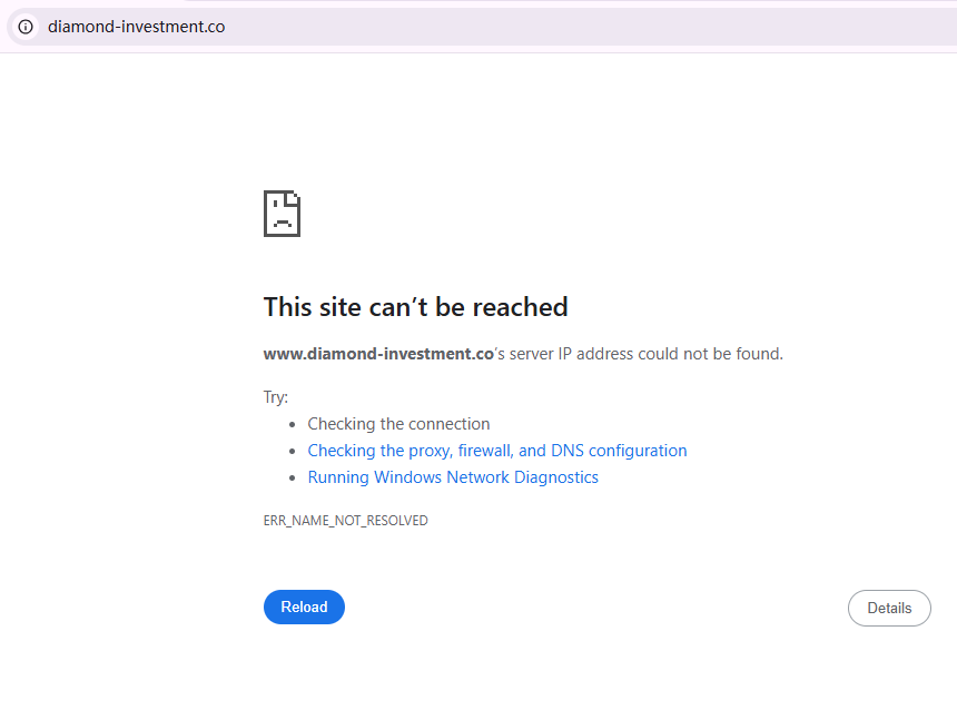 BrokersView found that the domain "https://www.diamond-investment.co/" is currently inaccessible. This is widely regarded as a significant red flag, as the suspension of a broker's website often points to underlying regulatory or operational issues.