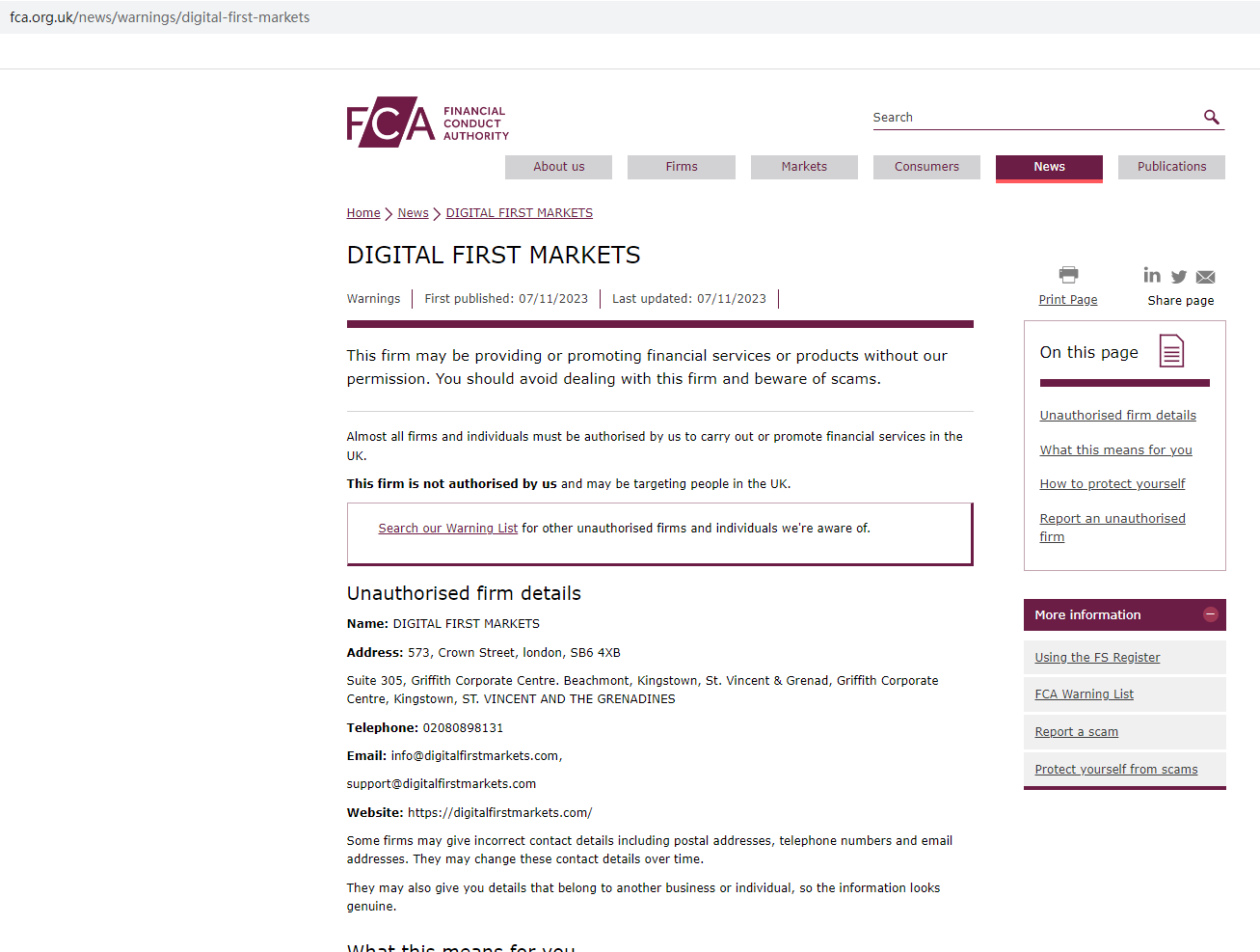 According to its website, it located in the UK and Saint Vincent. Upon investigation, we found that there is no matching information in the Financial Services Authority (SVG FSA) and the Financial Conduct Authority (FCA) issued a warning that DIGITAL FIRST MARKETS was providing finacial services or products without authorisation. The truth is that DIGITAL FIRST MARKETS is not regulated by any regulators. Letting it hold or control investors' money is unsafe, and the money can not be protected by any laws.DIGITAL FIRST MARKETS is a scam.