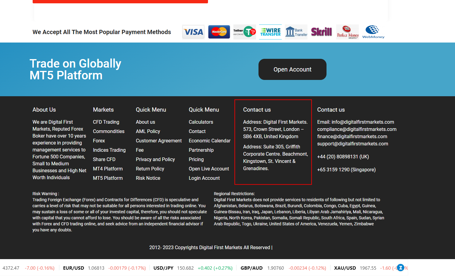 According to its website, it located in the UK and Saint Vincent. Upon investigation, we found that there is no matching information in the Financial Services Authority (SVG FSA) and the Financial Conduct Authority (FCA) issued a warning that DIGITAL FIRST MARKETS was providing finacial services or products without authorisation.
