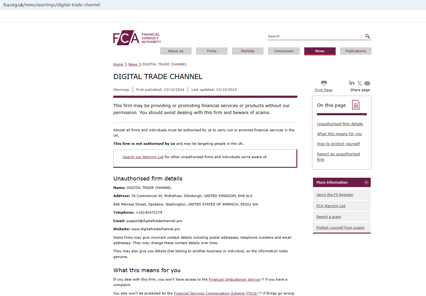 On Oct 23, 2024, the Financial Conduct Authority (FCA) issued a warning against Digital Trade Channel, believing this company might be providing financial services or products without proper authorization. https://www.fca.org.uk/news/warnings/digital-trade-channel