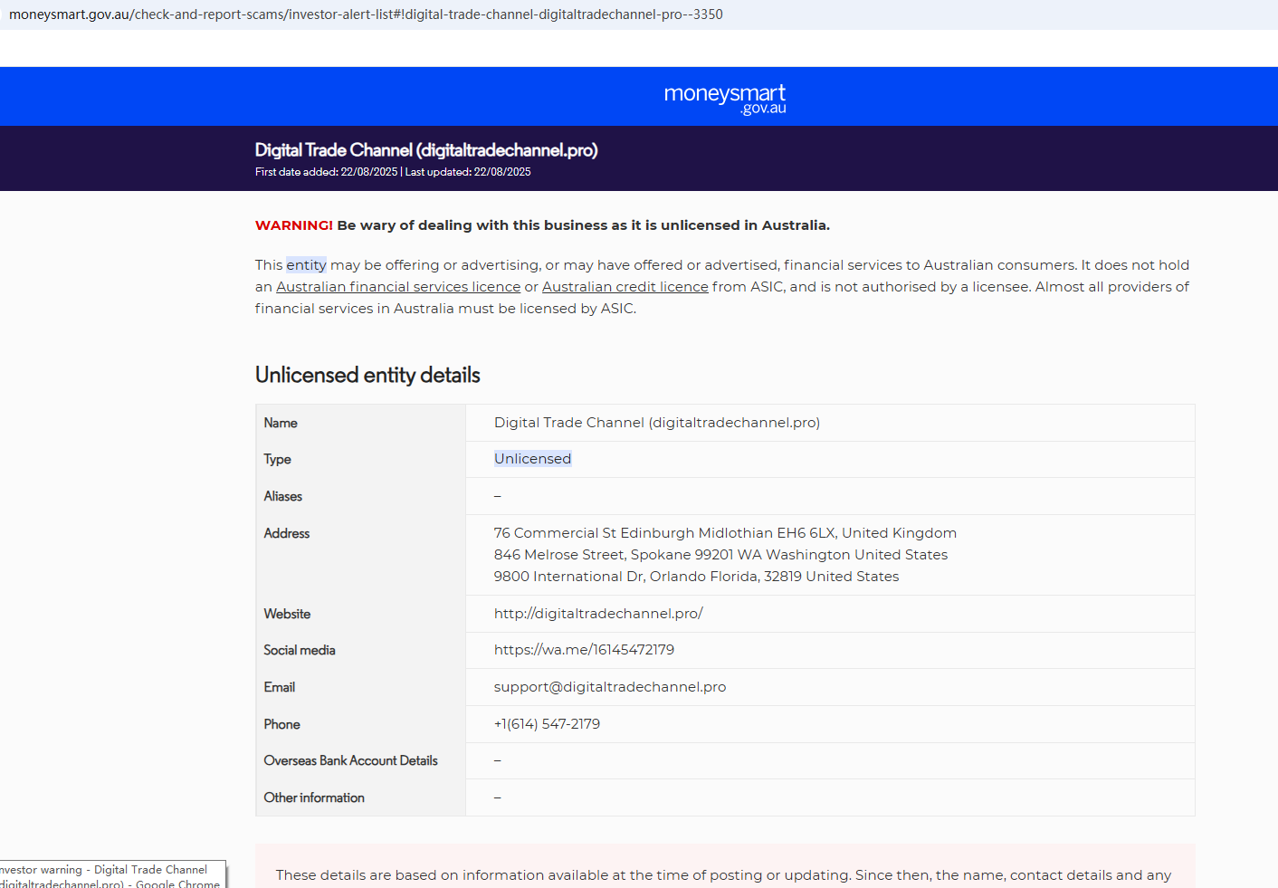 On Aug 22, 2025, the Australian Securities & Investments Commission (ASIC) issued a warning against Digital Trade Channel, believing this company might be providing financial services or products without proper authorization. https://moneysmart.gov.au/check-and-report-scams/investor-alert-list#!digital-trade-channel-digitaltradechannel-pro--3350