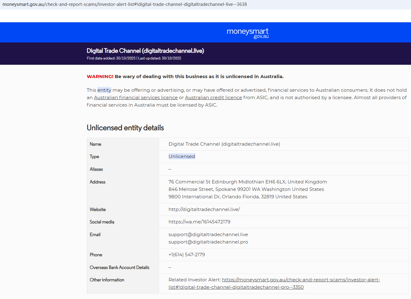 On Oct 30, 2025, the Australian Securities & Investments Commission (ASIC) issued a warning against Digital Trade Channe, believing this company might be providing financial services or products without proper authorization. https://moneysmart.gov.au/check-and-report-scams/investor-alert-list#!digital-trade-channel-digitaltradechannel-live--3638