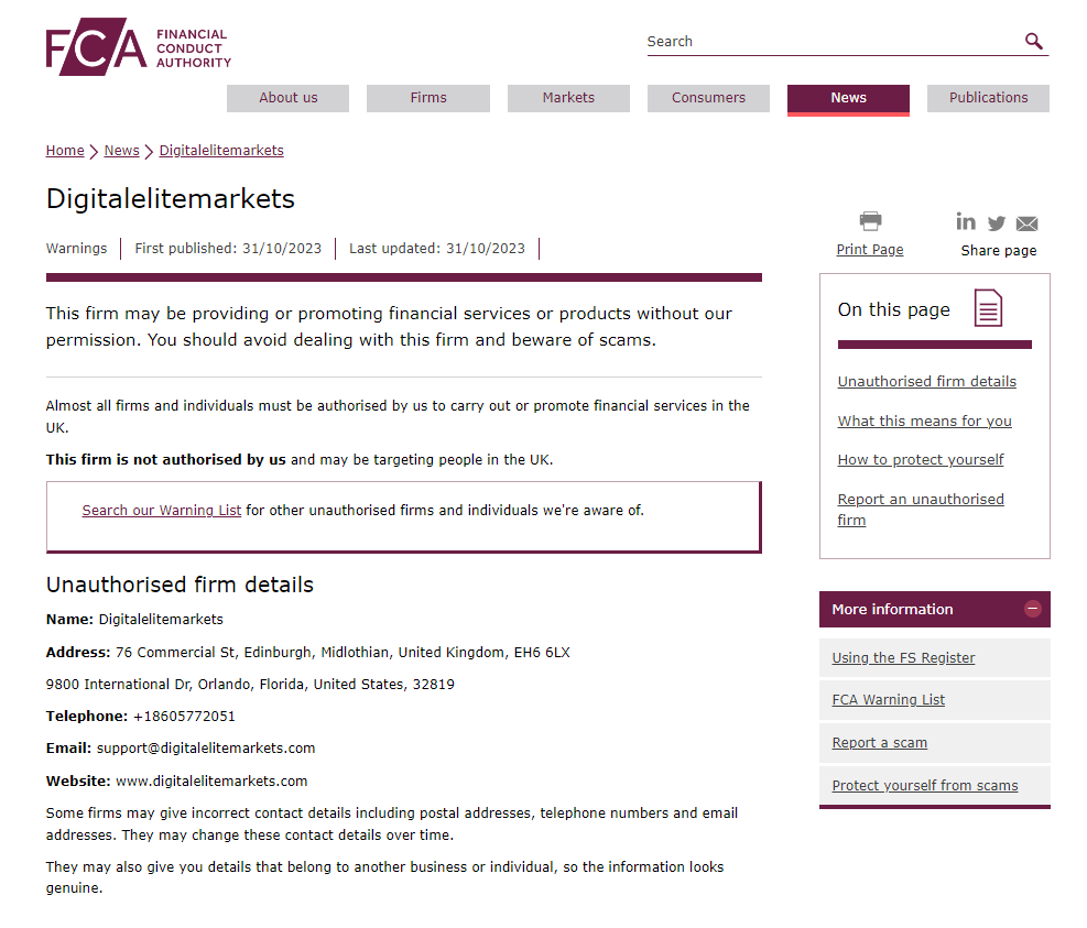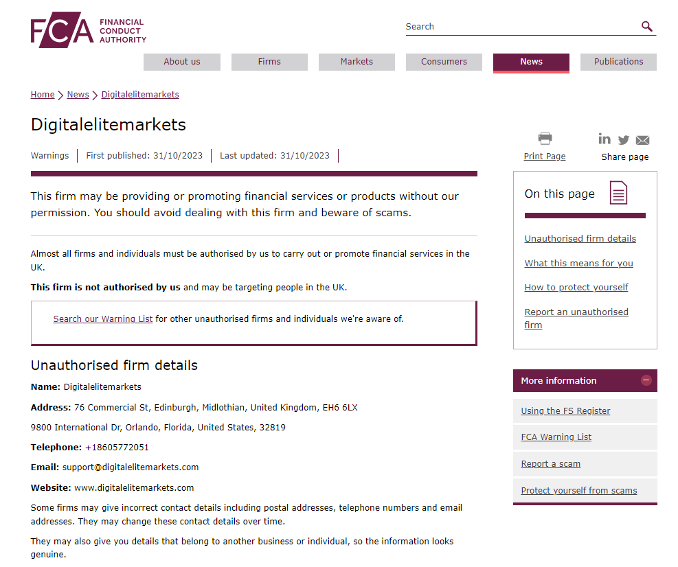 In addition, the United Kingdom Financial Conduct Authority (UK FCA) issued a warning that Digitalelitemarkets was providing finacial services or products without authorisation.