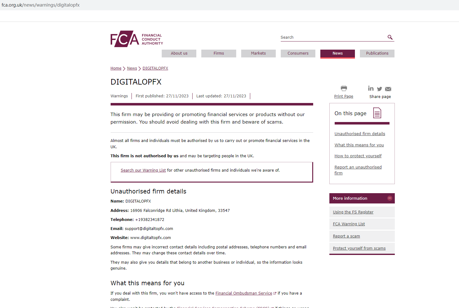 According to its website, it is located in the UK, upon investigation, we found that the United Kingdom Financial Conduct Authority (UK FCA) issued a warning that DIGITALOPFX was providing financial services or products in the UK without authorisation.
